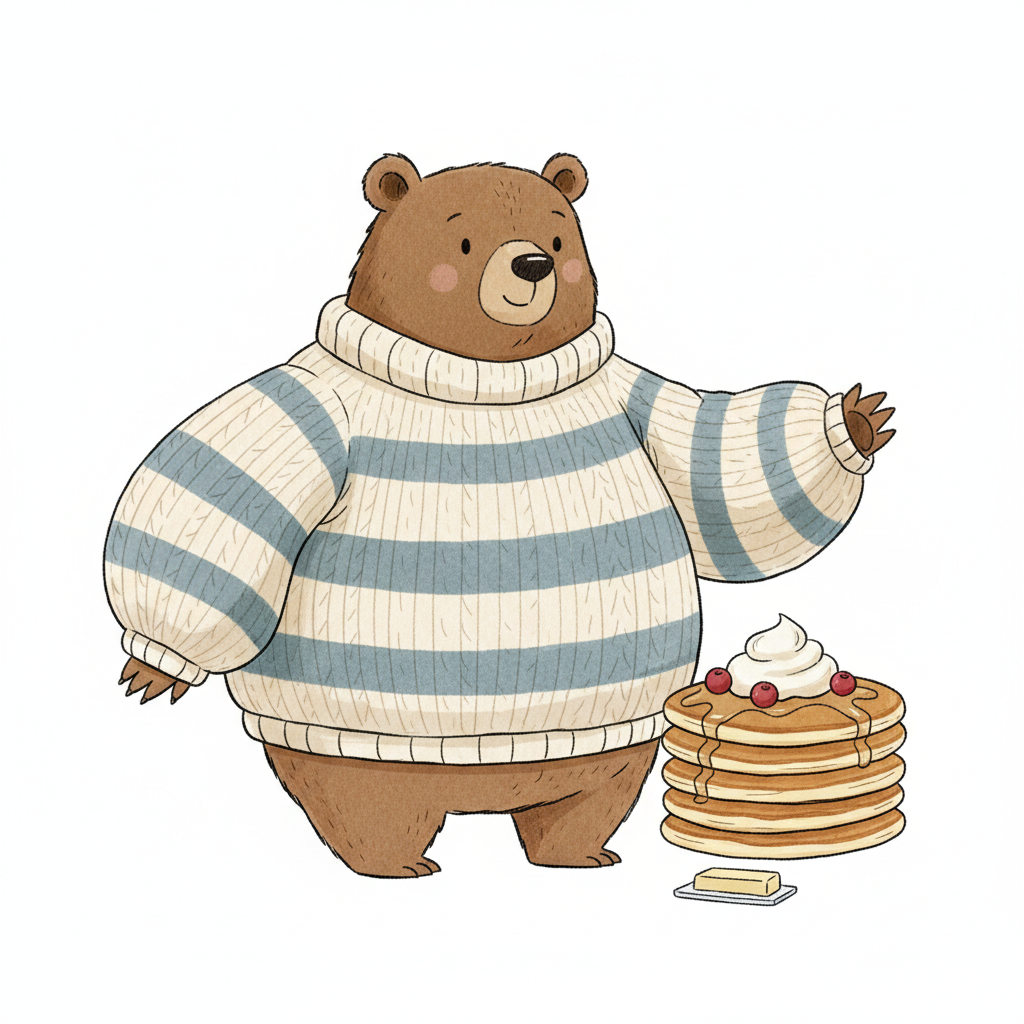 Glücklicher Cartoon-Bär mit dickem Bauch, der einen Burger hält, daneben Pfannkuchen.