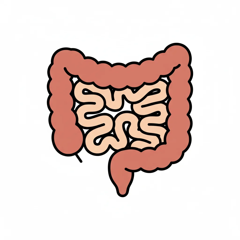 Aquarell-Illustration eines menschlichen Dickdarms in warmen Farben auf hellem Hintergrund.