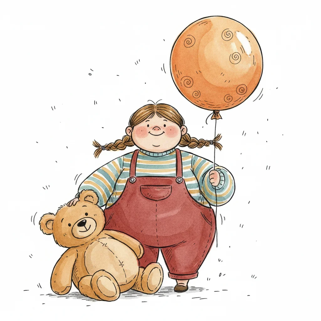 Fröhliches Cartoon-Mädchen mit Zöpfen, Latzhose, Teddybär und orangefarbenem Ballon.