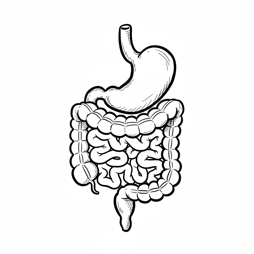 Schwarz-weiße Skizze des menschlichen Verdauungssystems mit Magen, Dünn- und Dickdarm.