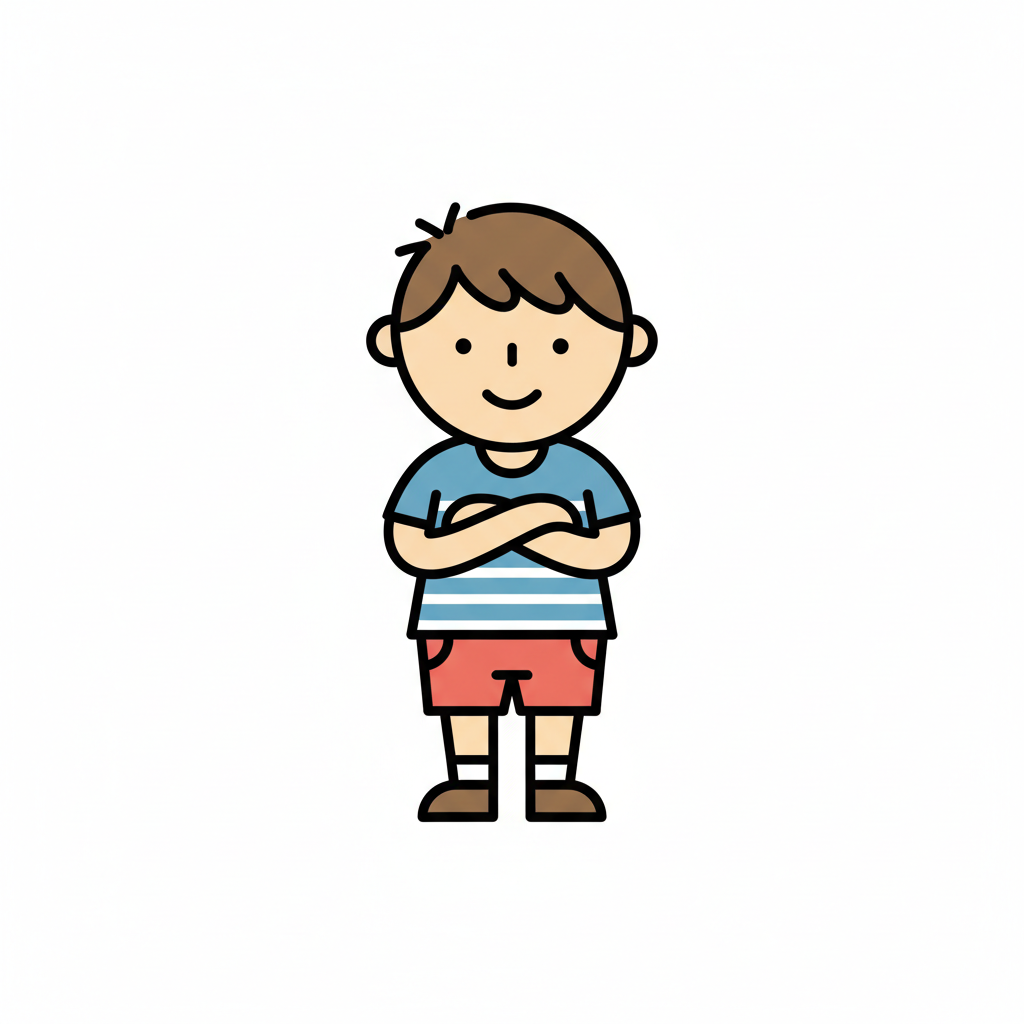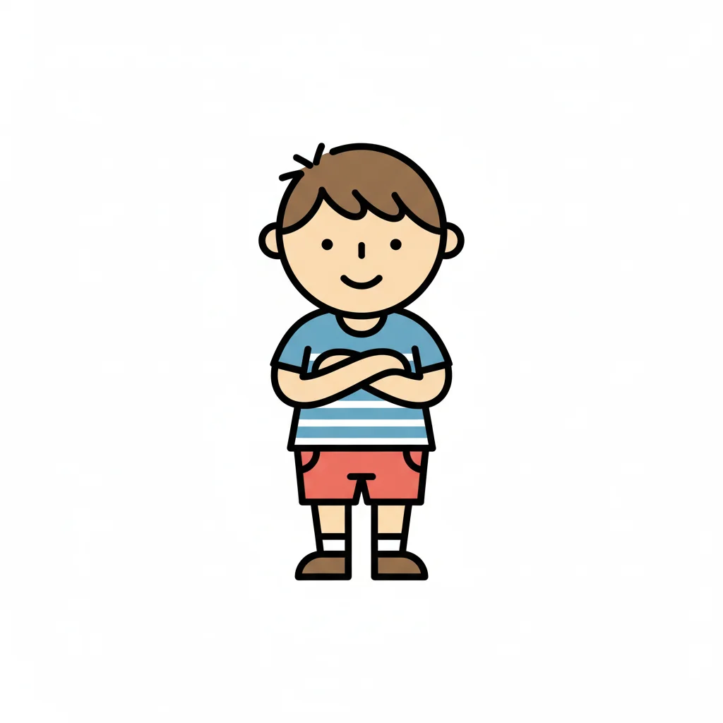 Ein selbstbewusster Junge in lässiger Kleidung mit verschränkten Armen.