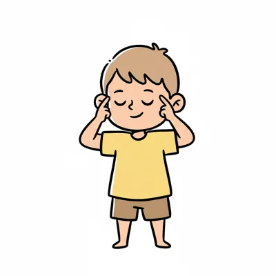 Junge mit geschlossenen Augen und lächelndem Gesichtsausdruck, Händen an den Schläfen.