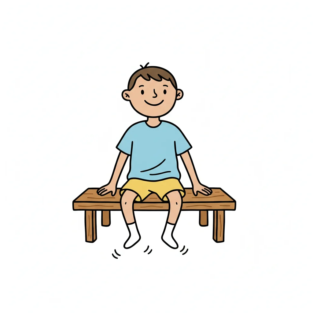 Ein fröhlicher Junge sitzt auf einer Bank und schwingt mit den Füßen.