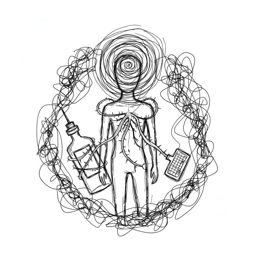 Strichzeichnung: Mensch mit wirbelndem Kopf, verbunden mit Flasche und Tastatur durch dornige Ranken, umgeben von Chaos.