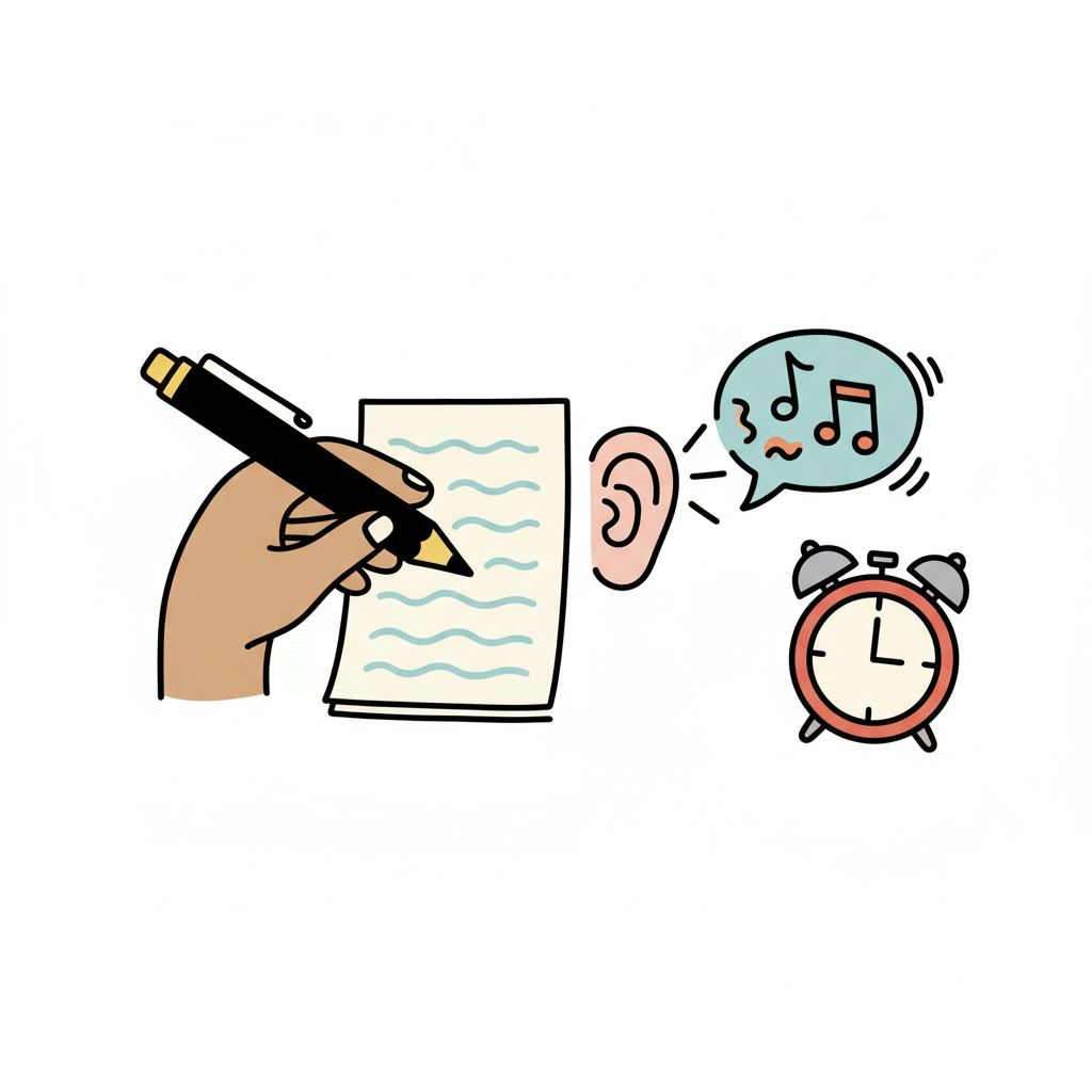 Eine Hand schreibt auf ein Blatt Papier, während ein Ohr Musik hört.
