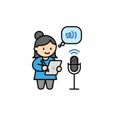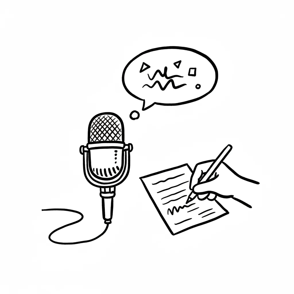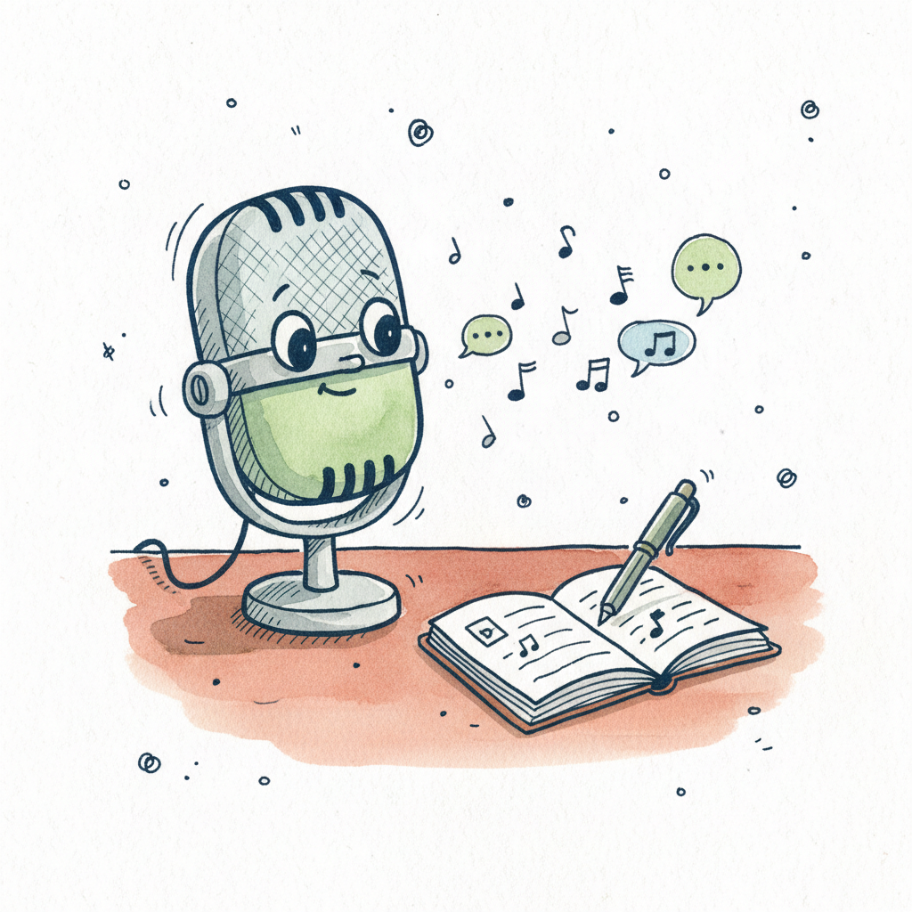 Ein fröhliches Mikrofon neben einem aufgeschlagenen Buch und einem Stift.