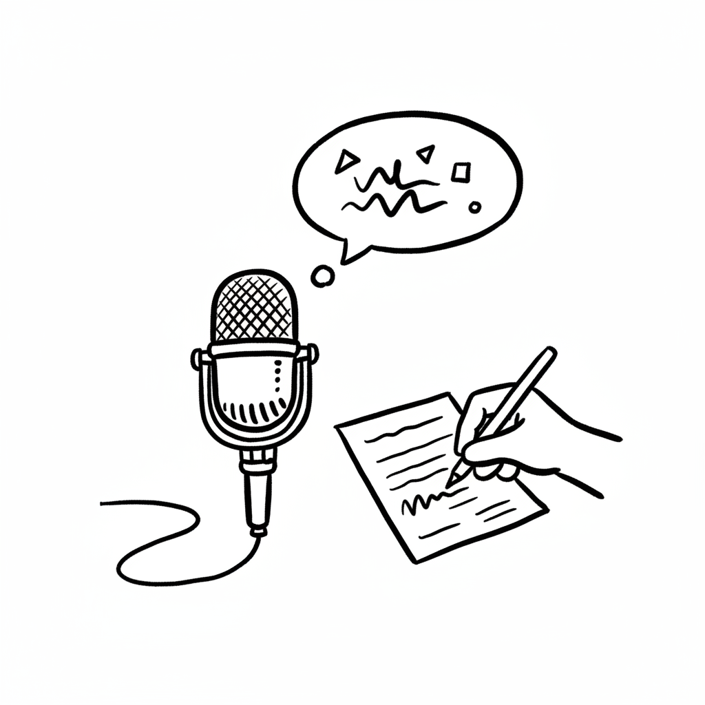 Mikrofon und Hand, die auf ein Blatt Papier schreiben.