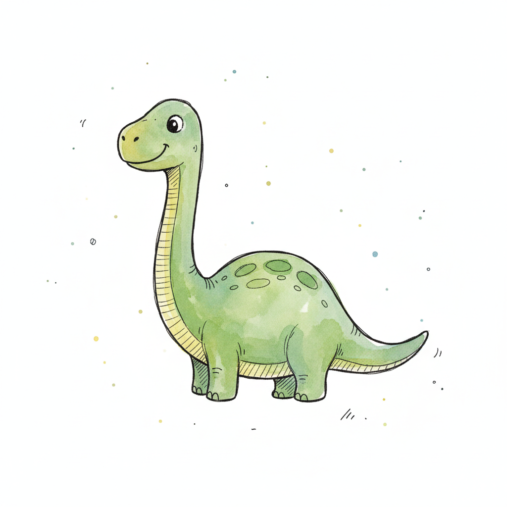 Ein fröhlicher, cartoonartiger Dinosaurier mit großer Hals.