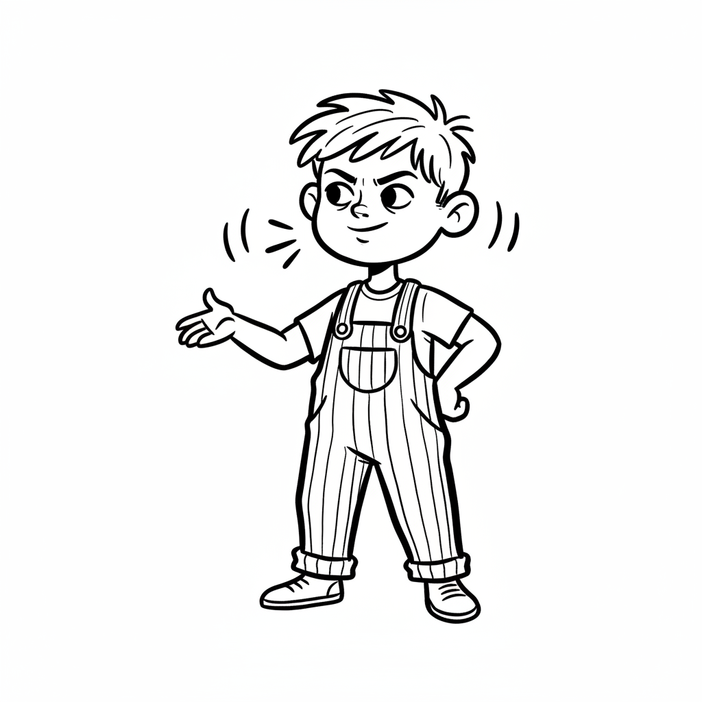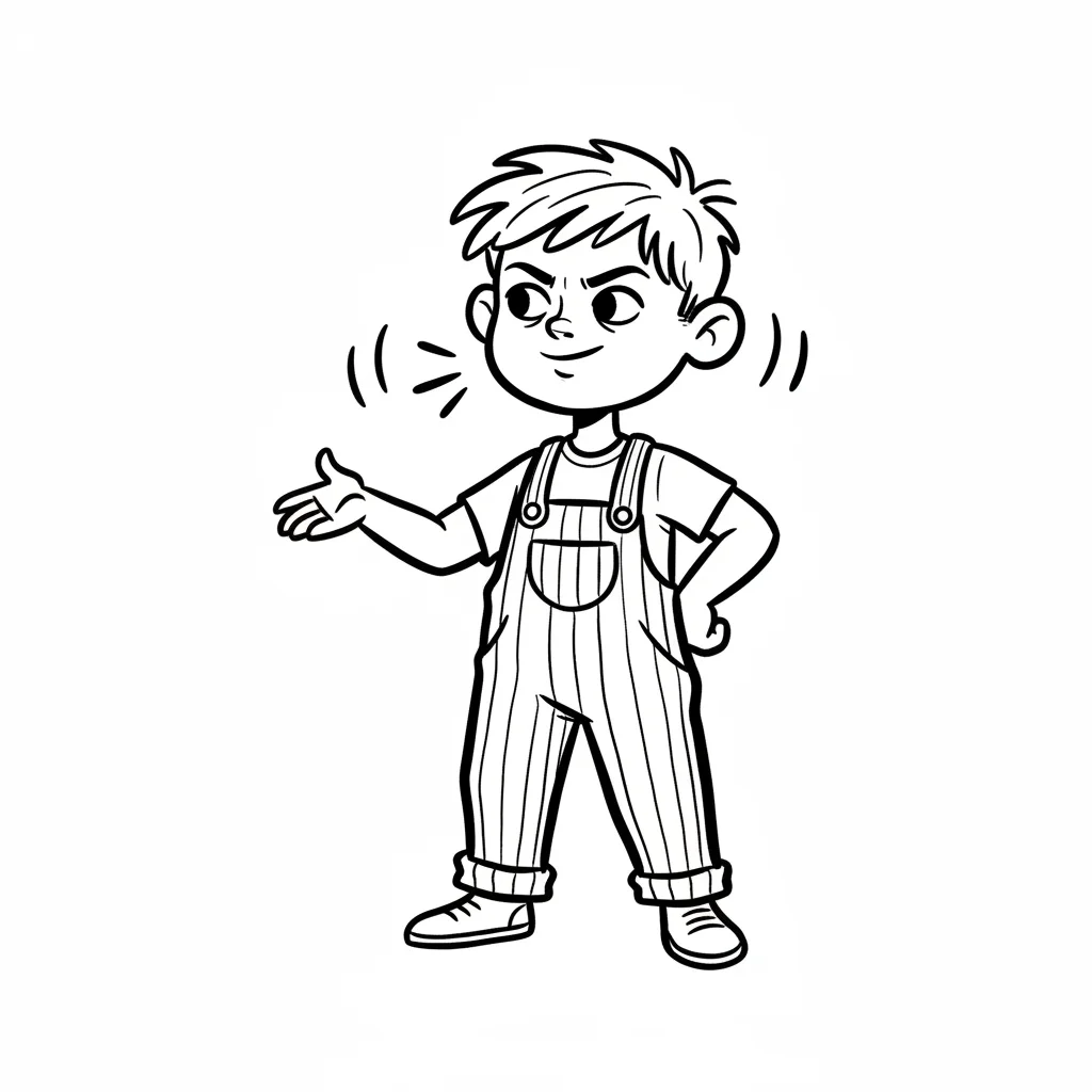 Junge in Latzhose, posiert selbstbewusst mit einem Lächeln.