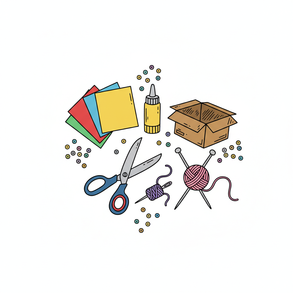 Eine bunte Ansammlung von Bastelmaterialien wie Papier, Schere, Kleber, Wolle und Karton.