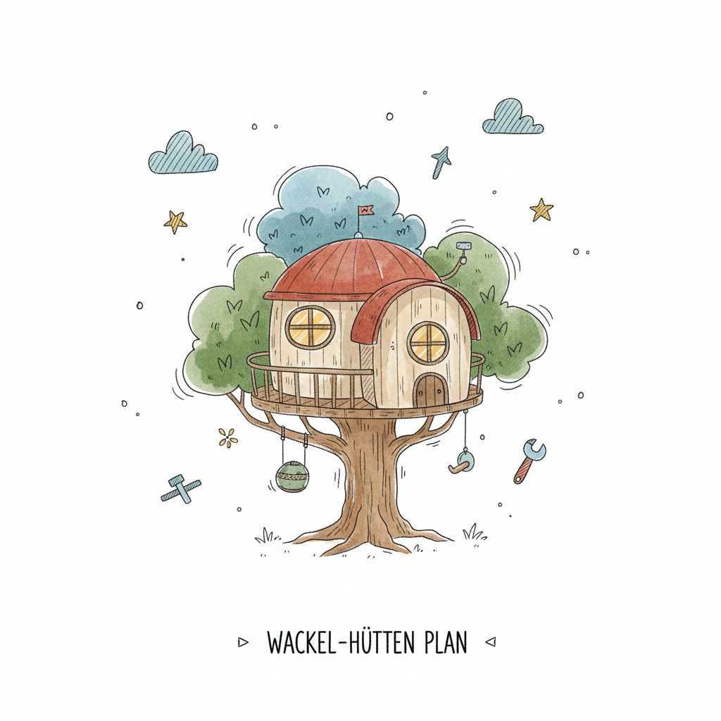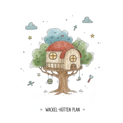 Aquarell-Illustration eines verspielten Baumhauses mit rotem Dach, runden Fenstern und Bau-Elementen.