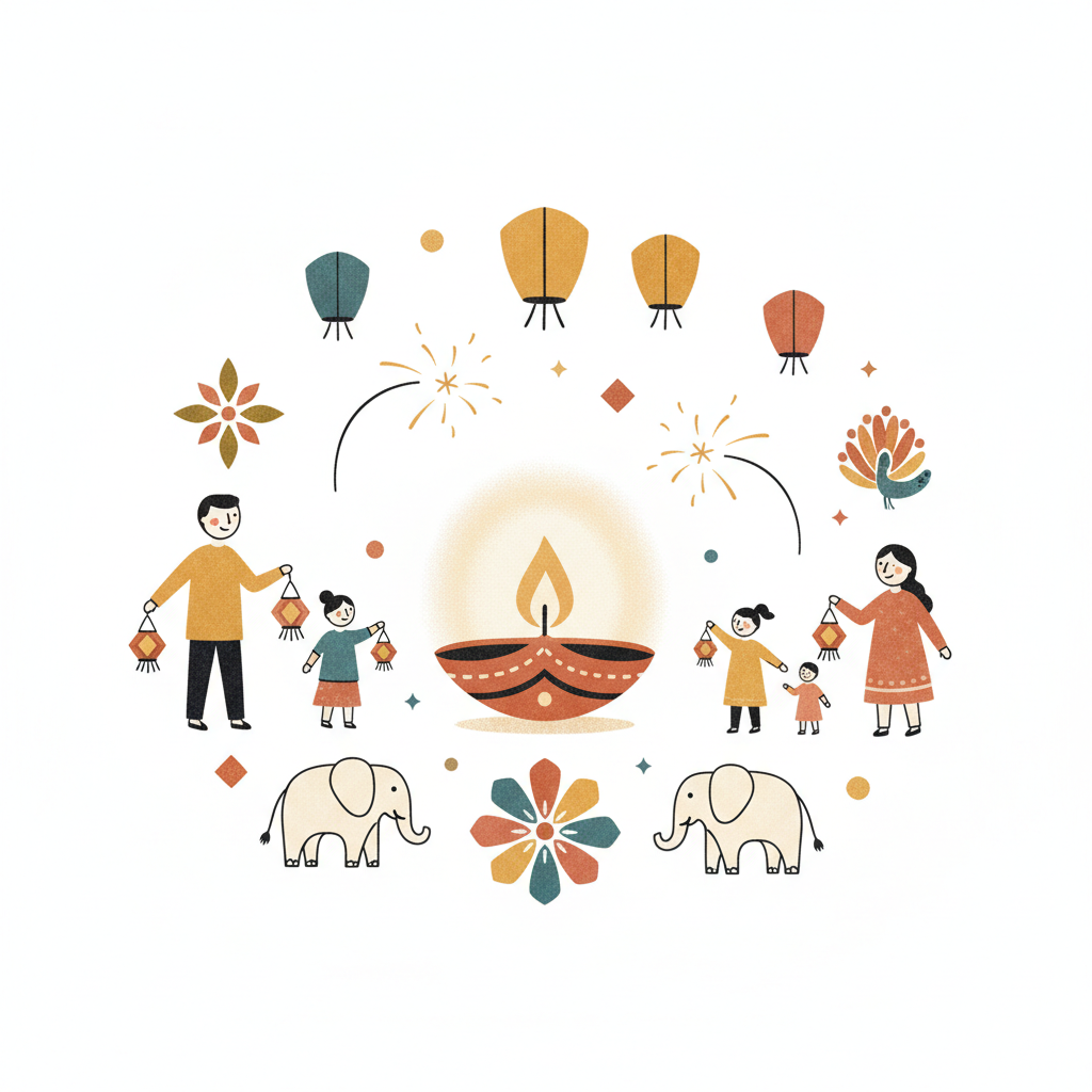 Festliche Illustration von Familien, die Diwali mit Diyas, Laternen, Elefanten und Feuerwerk feiern.