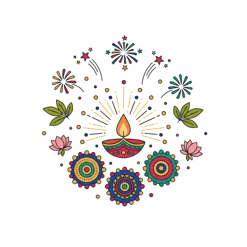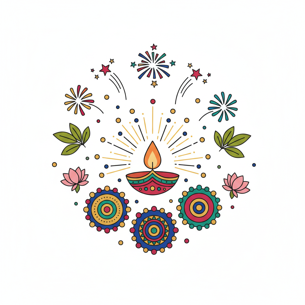 Buntes Diwali-Design mit leuchtender Diya, Feuerwerk, Blumen und Mandalas auf weißem Grund.