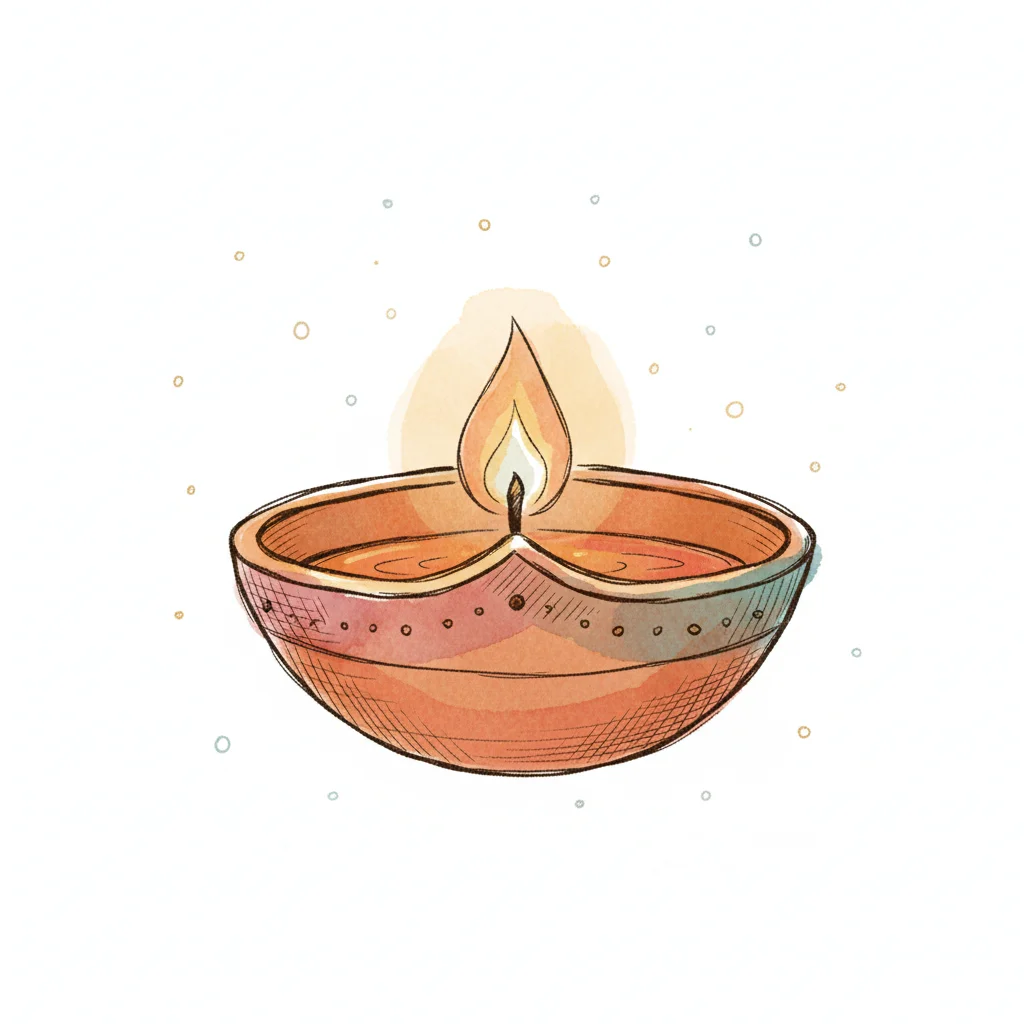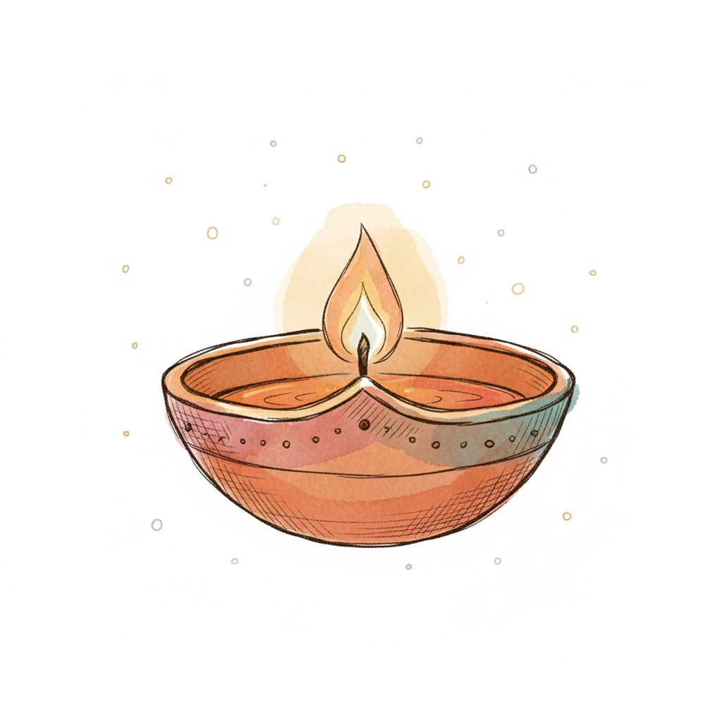 Gemalte Diya-Öllampe mit Flamme und warmem Schein auf weißem Hintergrund.
