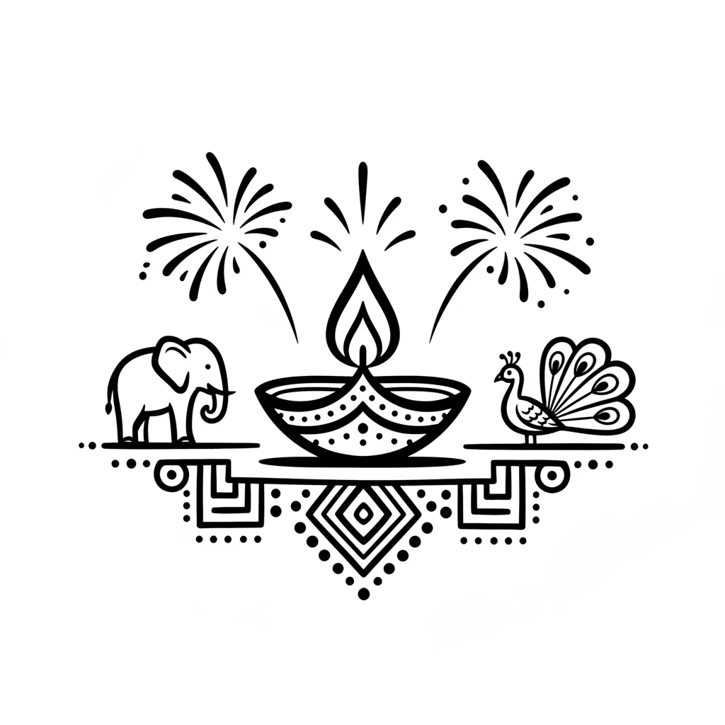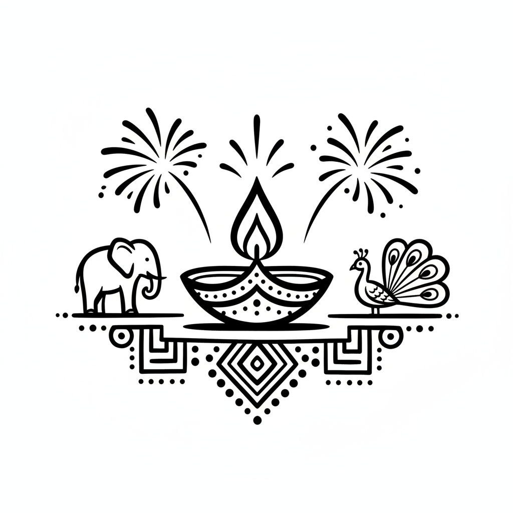 Schwarz-weiße Illustration einer Diya mit Elefant, Pfau und Feuerwerk, umgeben von Mustern.