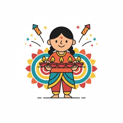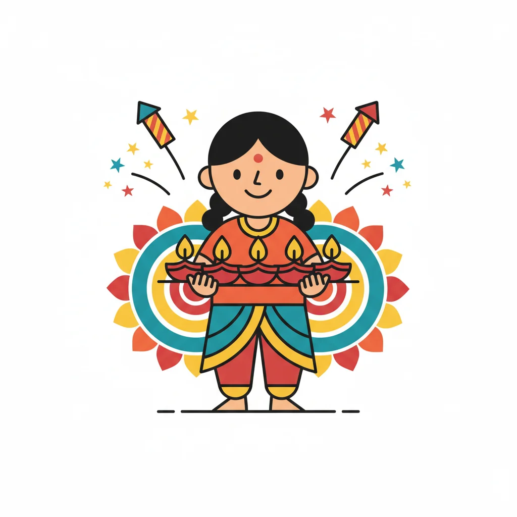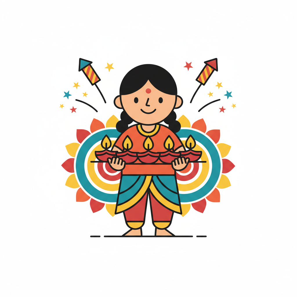 Fröhliches Cartoon-Mädchen hält Diyas vor Rangoli und Feuerwerk, feiert Diwali.