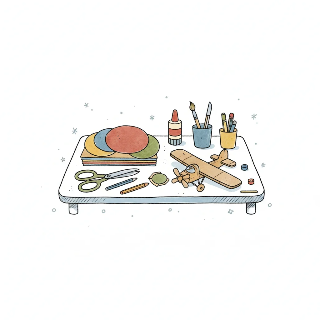Kreativer Basteltisch mit Papier, Schere, Kleber, Pinseln und einem Holzflugzeug.