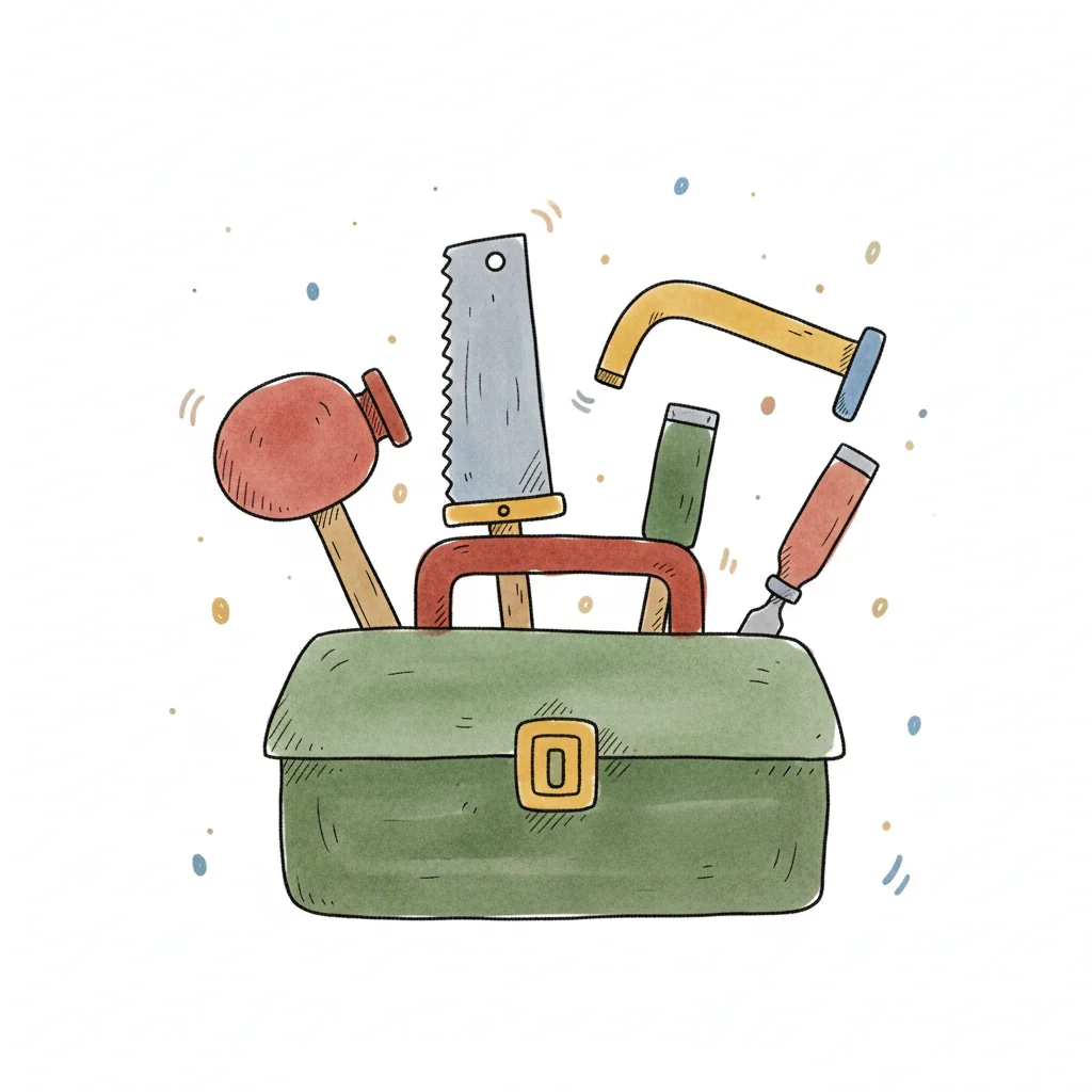 Cartoon-Werkzeugkiste mit Säge, Pümpel, Meißel und Wasserhahn in Aquarell-Optik.