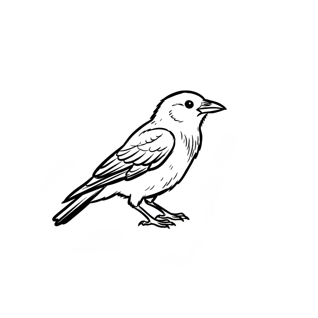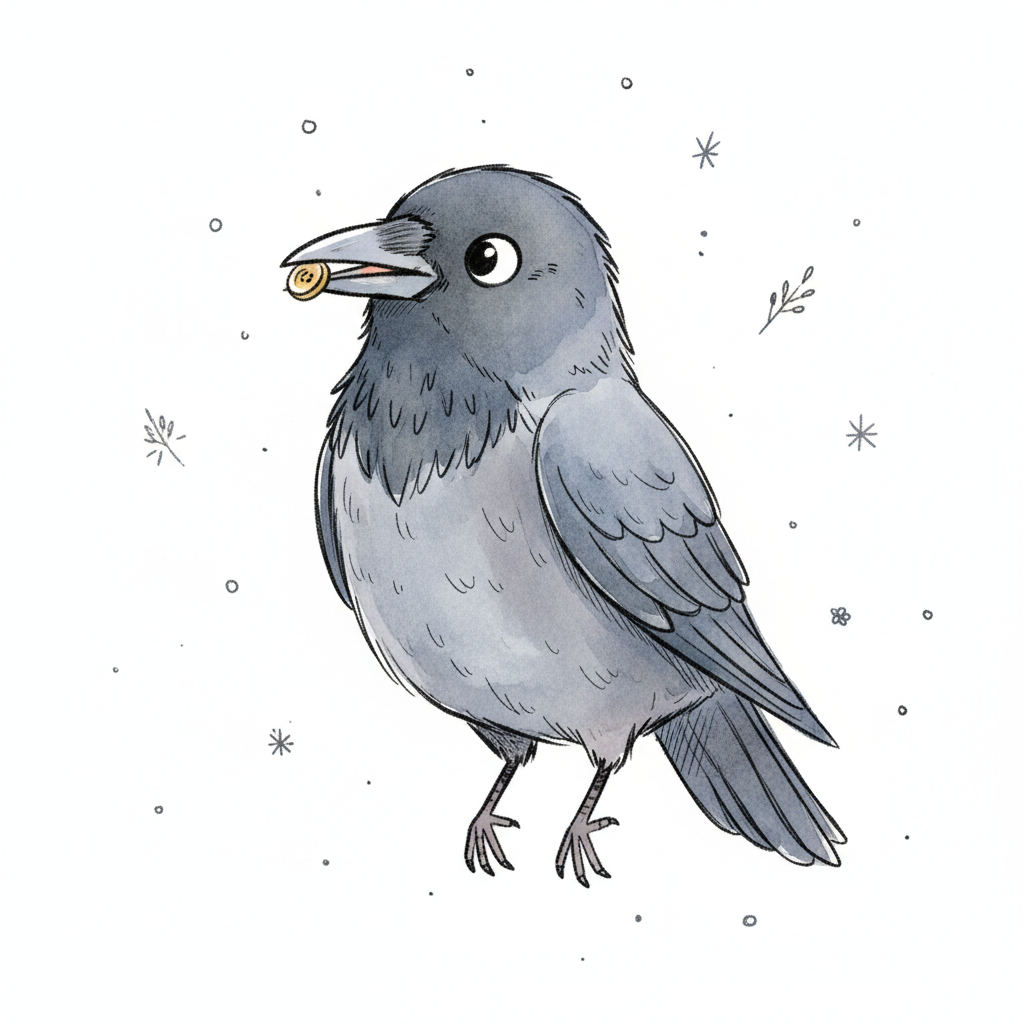 Eine cartoonartige Krähe mit einem kleinen Gegenstand im Schnabel.