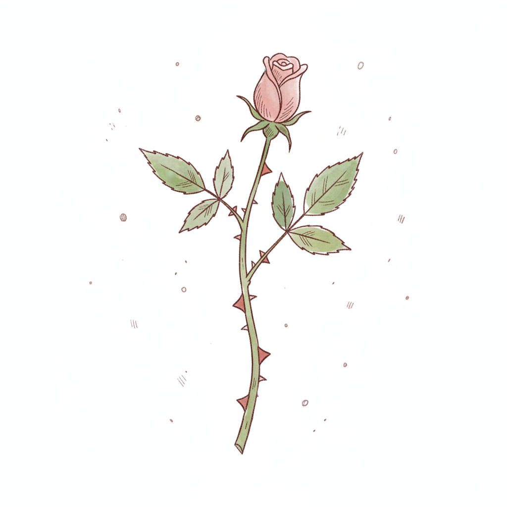 Eine zarte, rosa Rose mit grünen Blättern und Dornen.