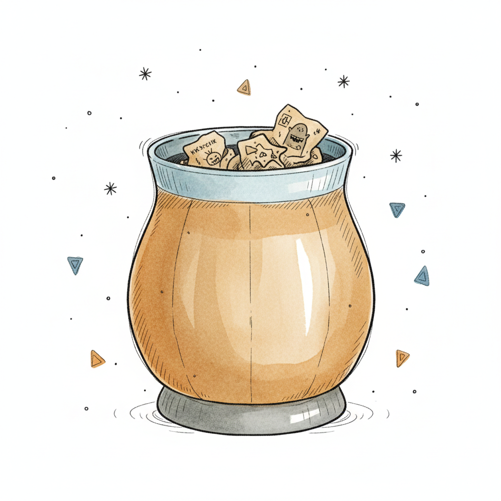 Illustrierte Tasse mit lustigen Gesichtern auf Papierstücken, umgeben von Sternen und Dreiecken.