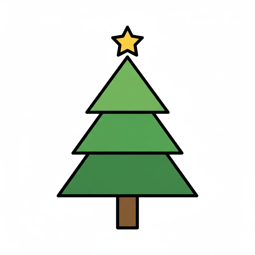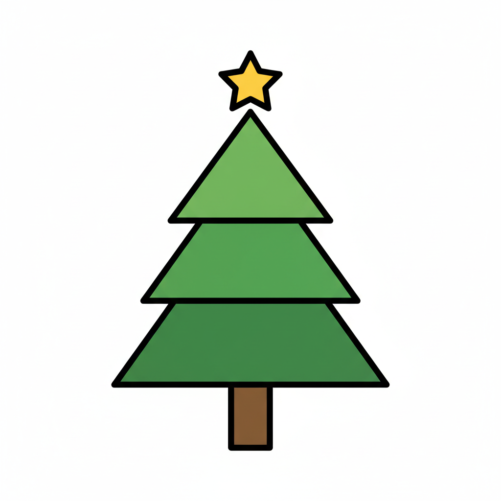 Stilisierter Weihnachtsbaum mit gelbem Stern auf der Spitze, grünen Dreiecken und braunem Stamm.