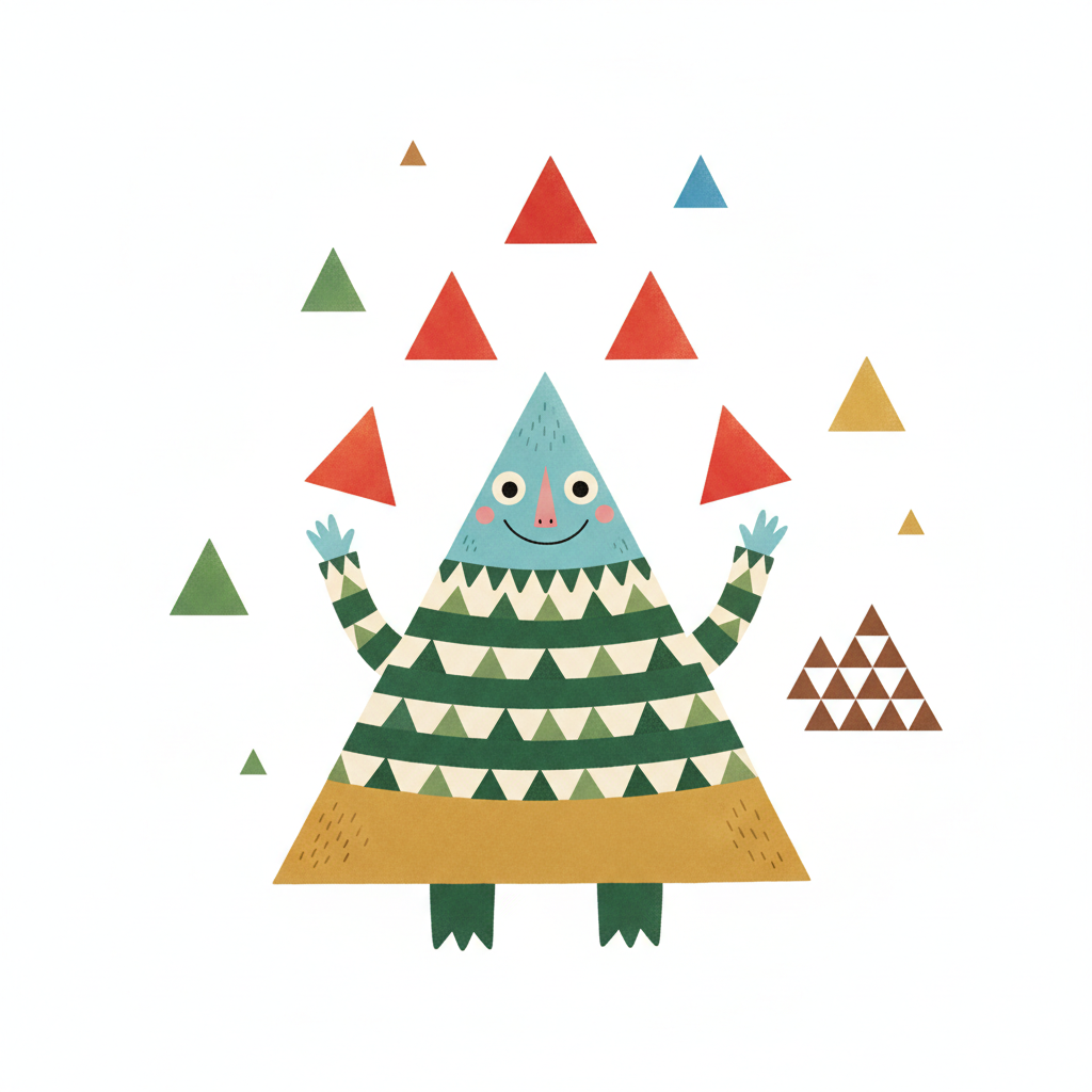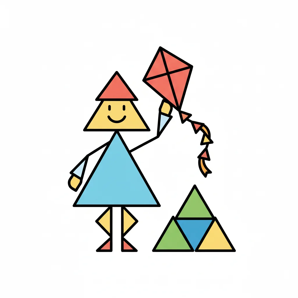 Bunte Figur aus Dreiecken, die einen Drachen hält, mit gestapelten Dreiecken daneben.