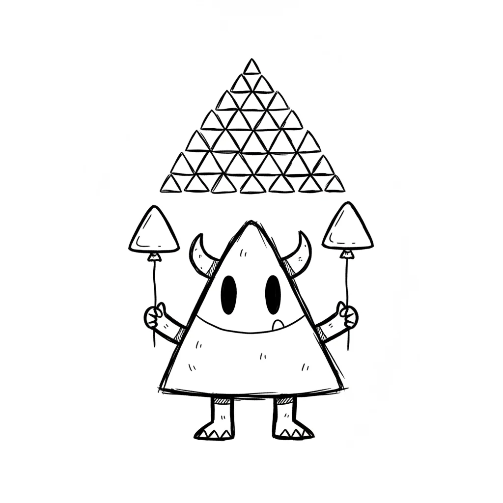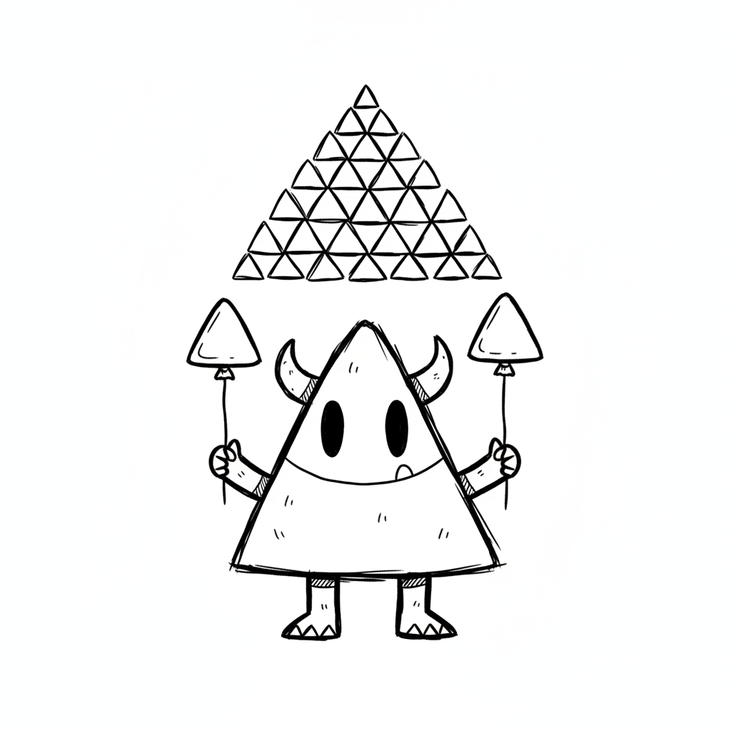 Schwarz-weiße Skizze eines dreieckigen Monsters mit Hörnern, das Ballons hält, unter einer Pyramide aus Dreiecken.
