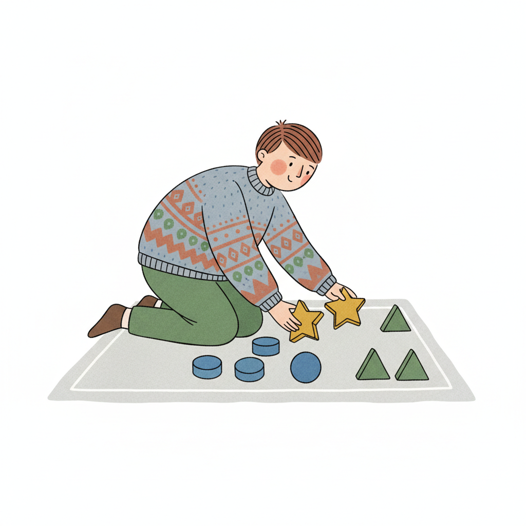 Eine Person kniet und sortiert geometrische Formen (Sterne, Kreise, Dreiecke) auf einem Teppich.