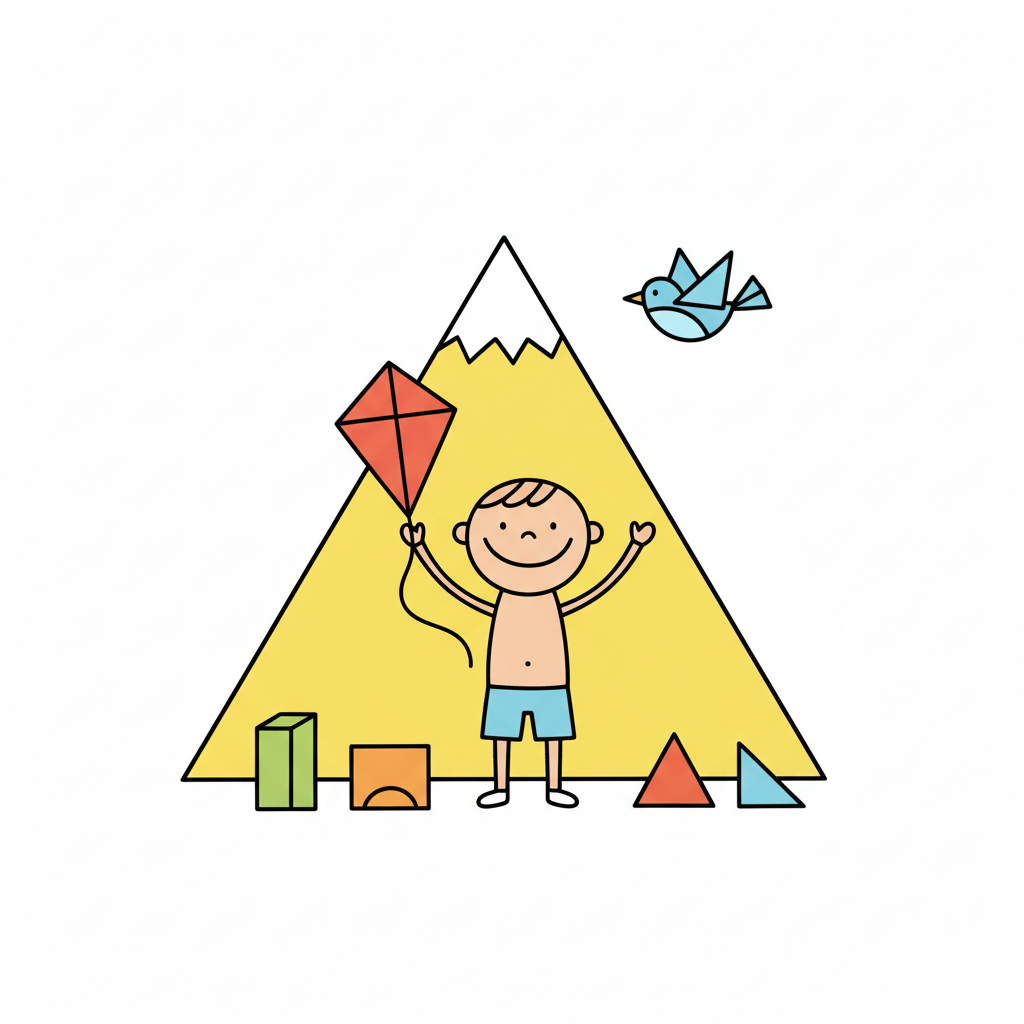 Bunte Figur aus Dreiecken, die einen Drachen hält, mit gestapelten Dreiecken daneben.