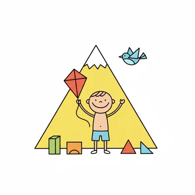 Fröhlicher Junge mit Drachen vor einem Berg, umgeben von Spielzeugblöcken und einem Vogel.