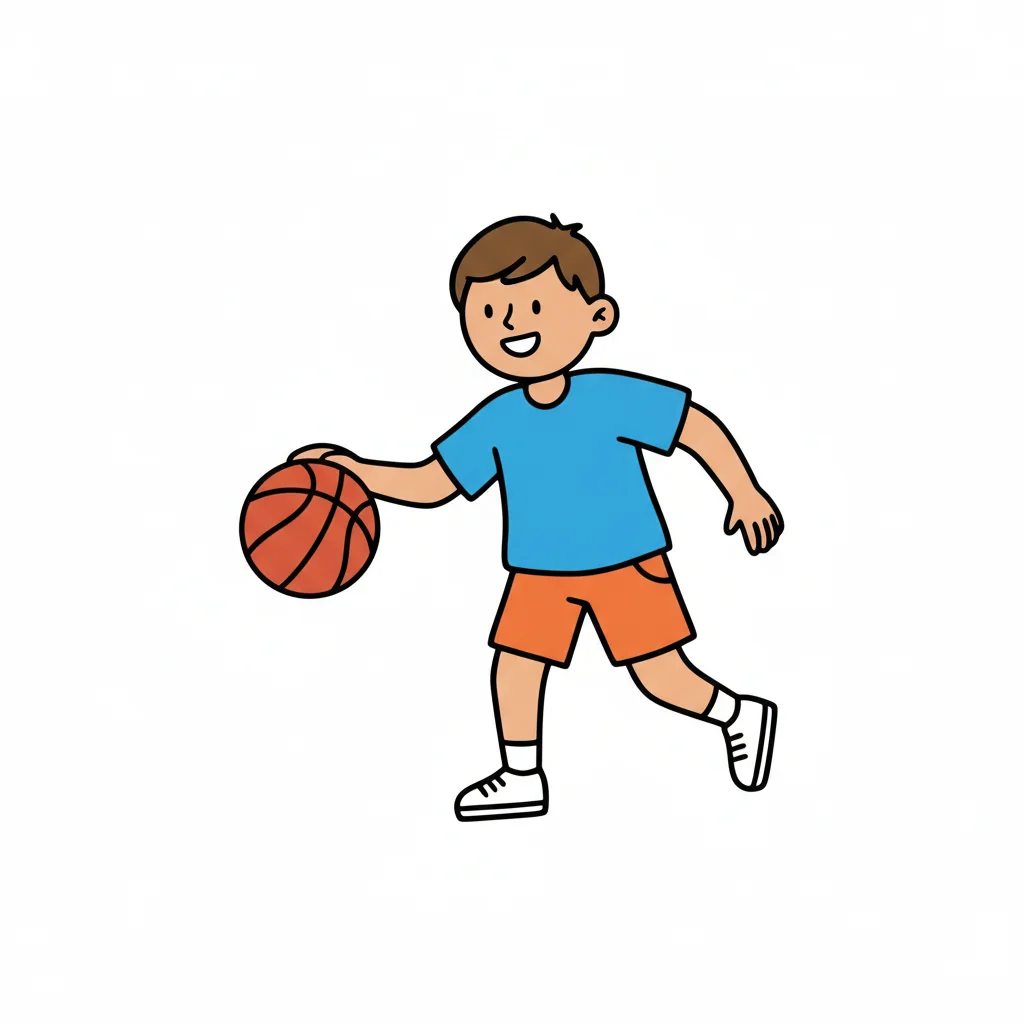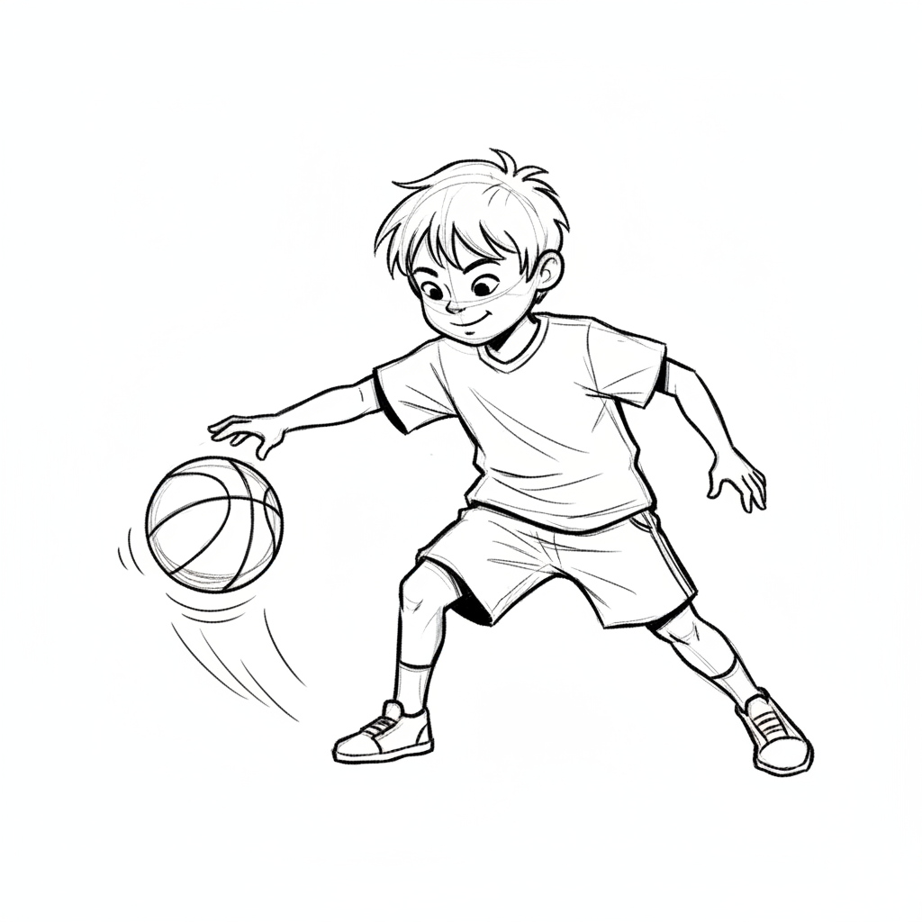 Ein Junge dribbelt einen Basketball mit Freude.
