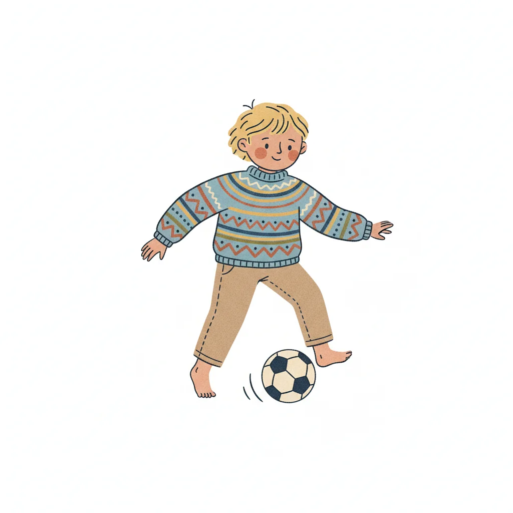 Ein Junge mit einem gestrickten Pullover spielt barfuß Fußball.