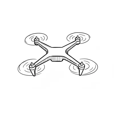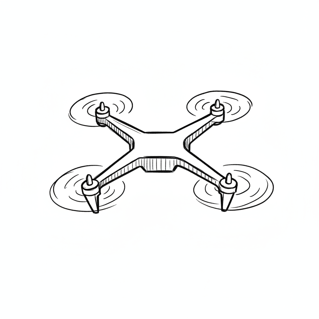 Handgezeichnete Skizze einer Drohne (Quadcopter) mit sich drehenden Propellern.