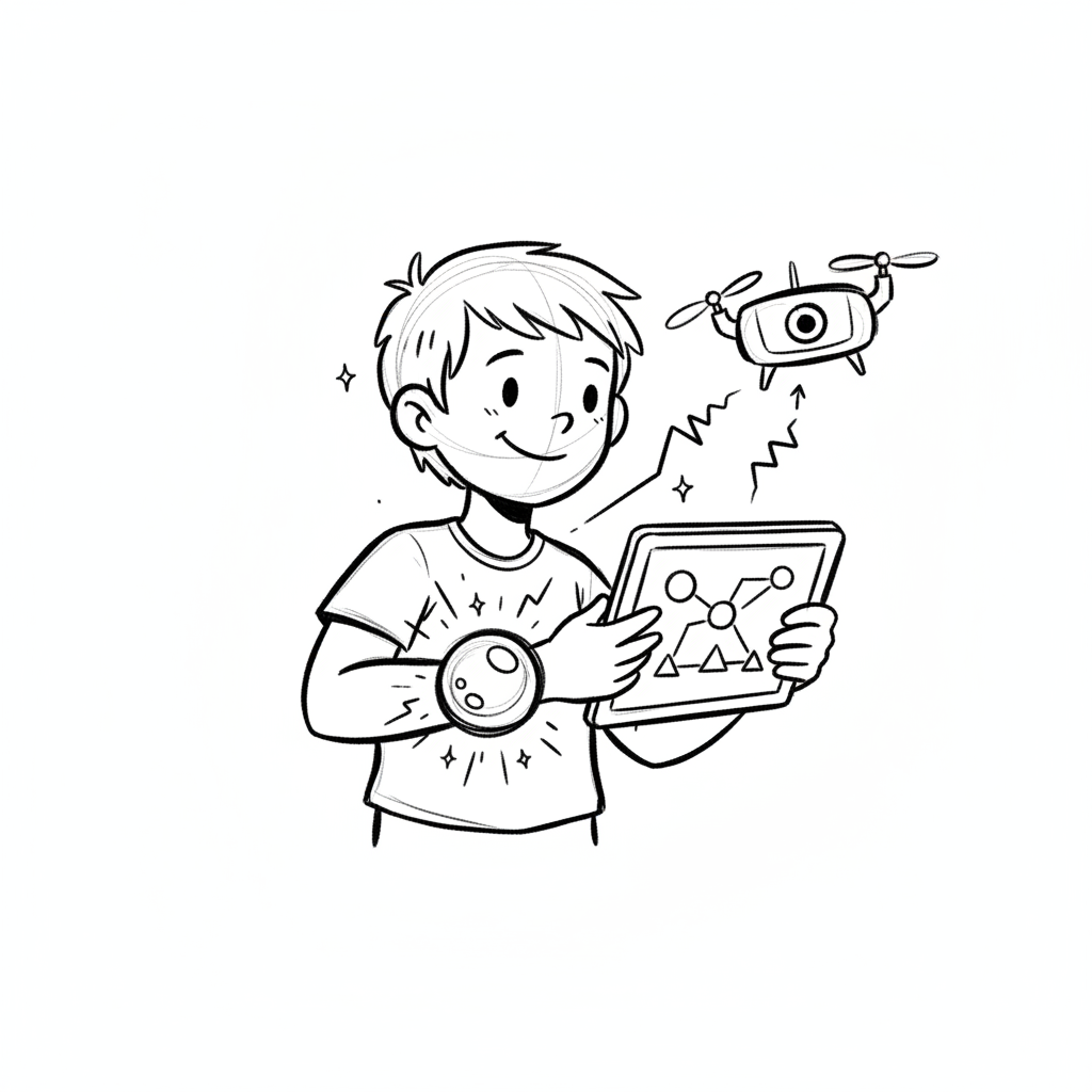 Ein lächelnder Junge steuert eine Drohne mit einem Tablet und einem futuristischen Armband.