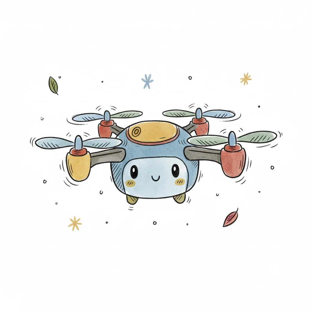 Illustration einer Drohne mit vier Rotoren und einer Frontkamera in Cartoon-Stil.