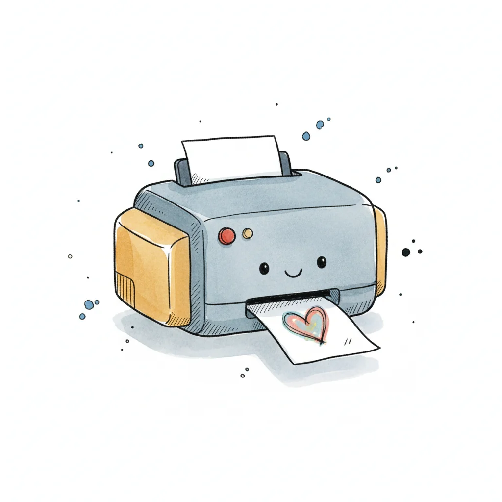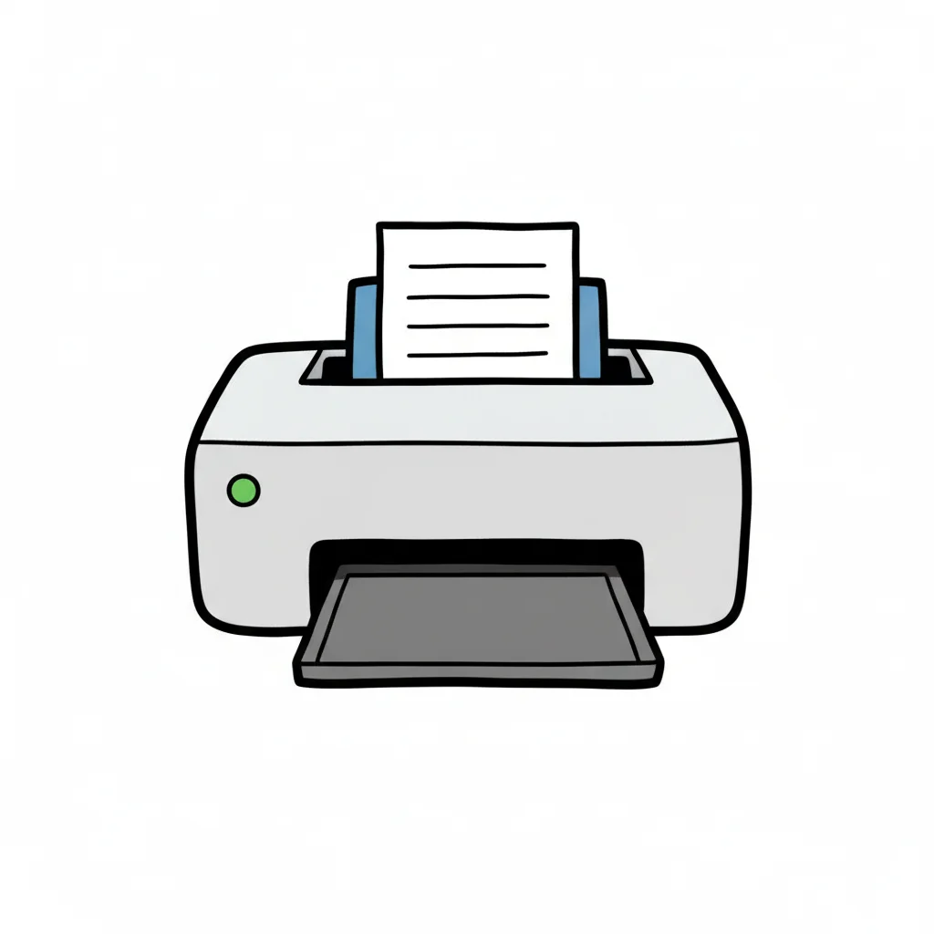 Ein einfacher, skizzenhafter Drucker mit einem Ausdruck.