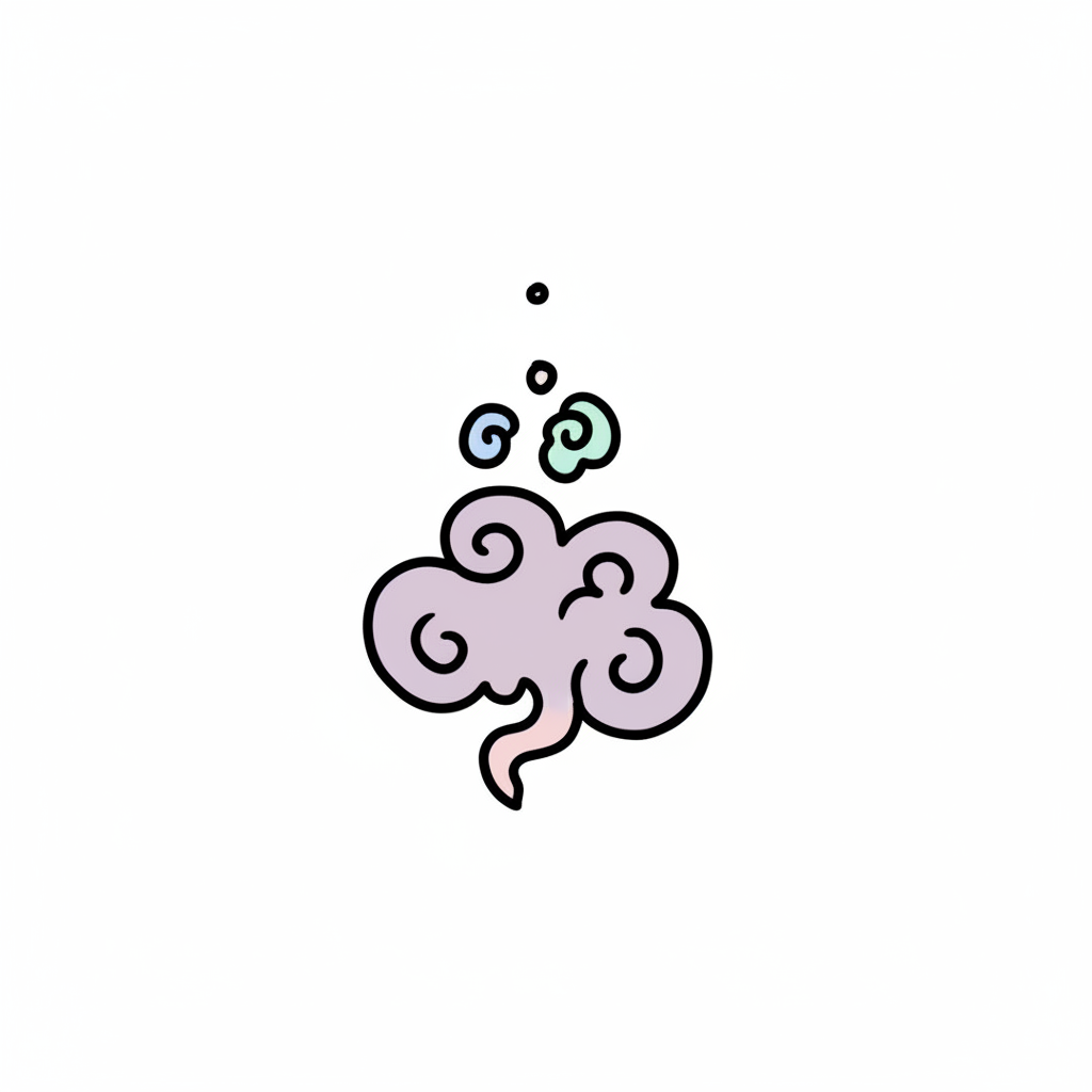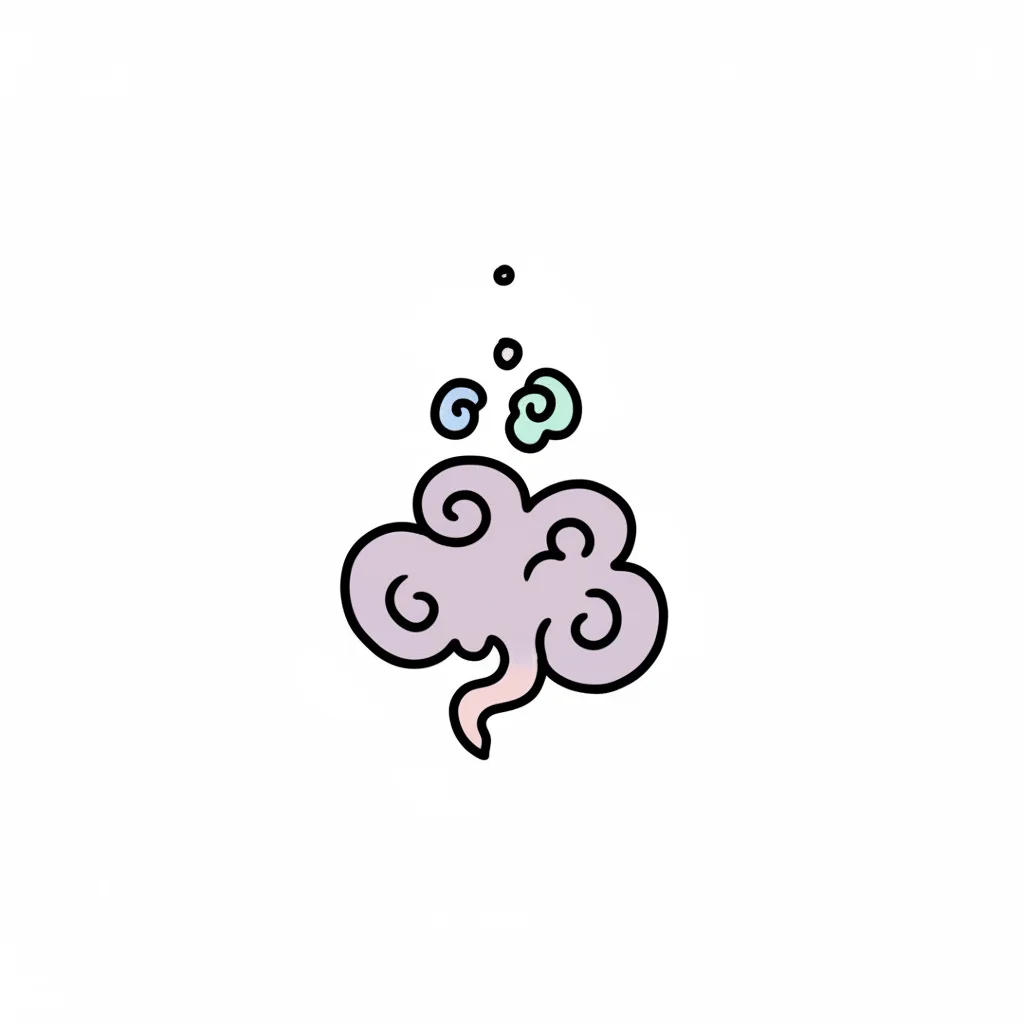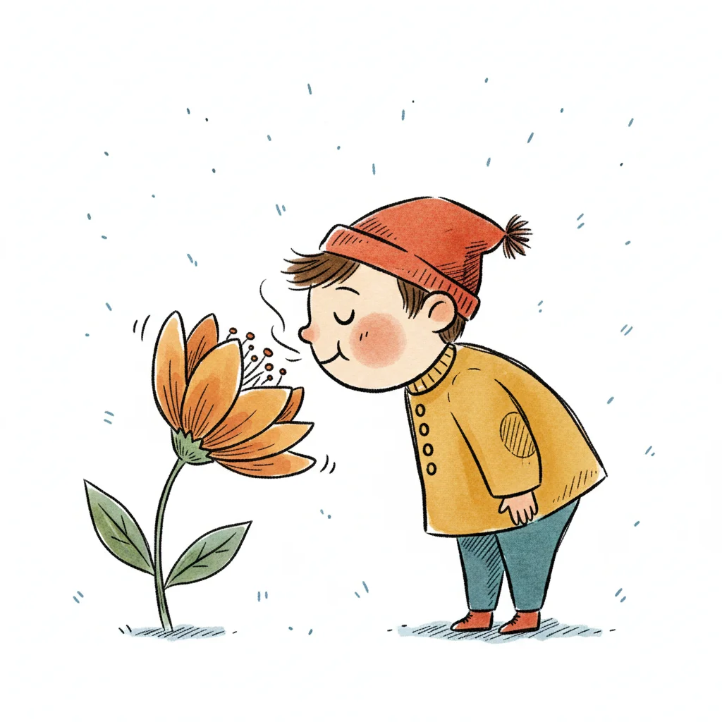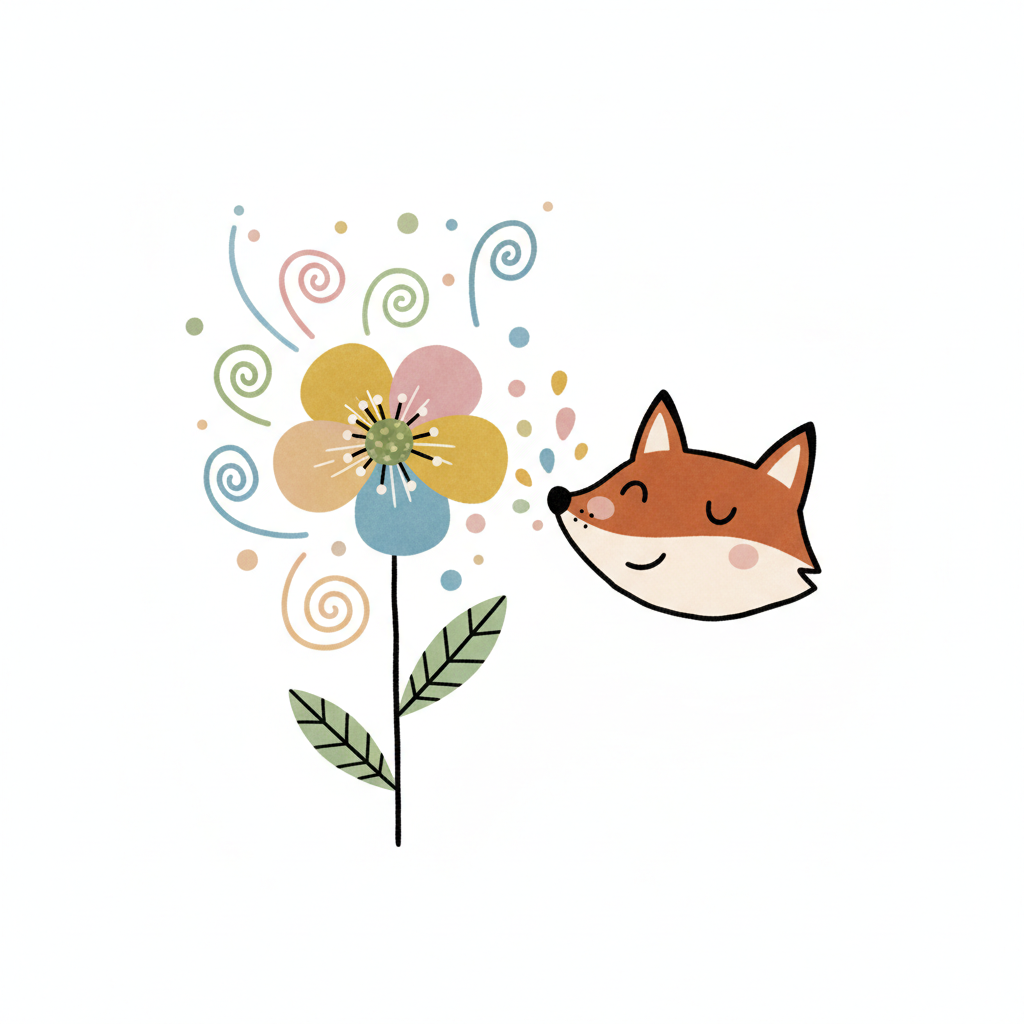 Eine lächelnde Cartoon-Nase riecht einen süßen Blumenduft, der als fröhliche Wolke dargestellt ist.