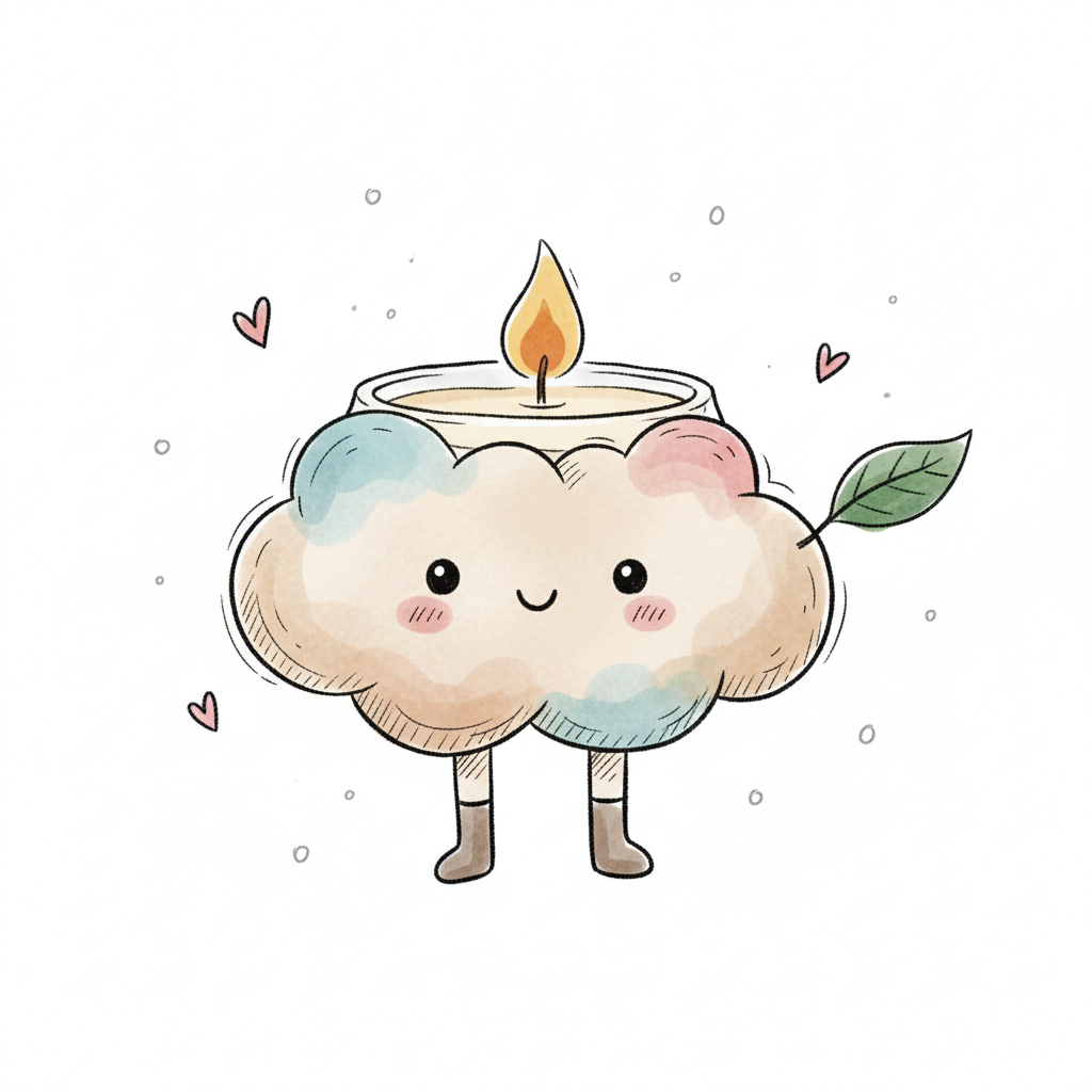 Niedliche, lächelnde Wolke mit brennender Kerze, Beinen und Blatt im Aquarell-Cartoon-Stil.