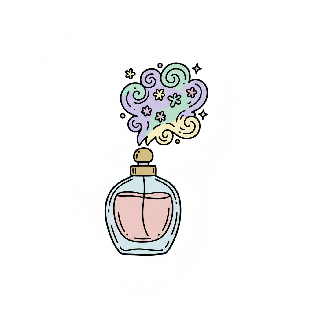 Bunte Illustration eines Parfümflakons, aus dem duftende, magische Wolken mit Sternen aufsteigen.