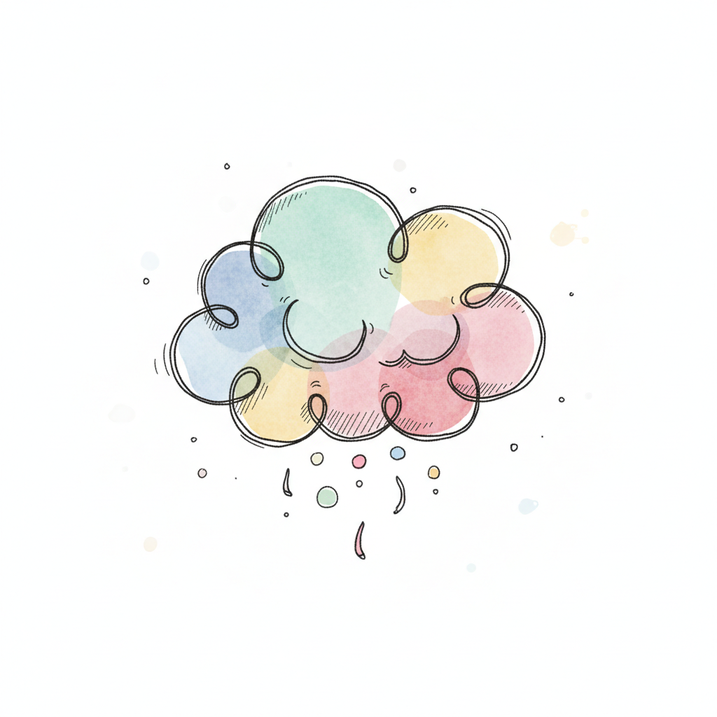 Zarte Aquarell-Illustration: Überlappende, pastellfarbene Kreise mit verspielten Elementen.