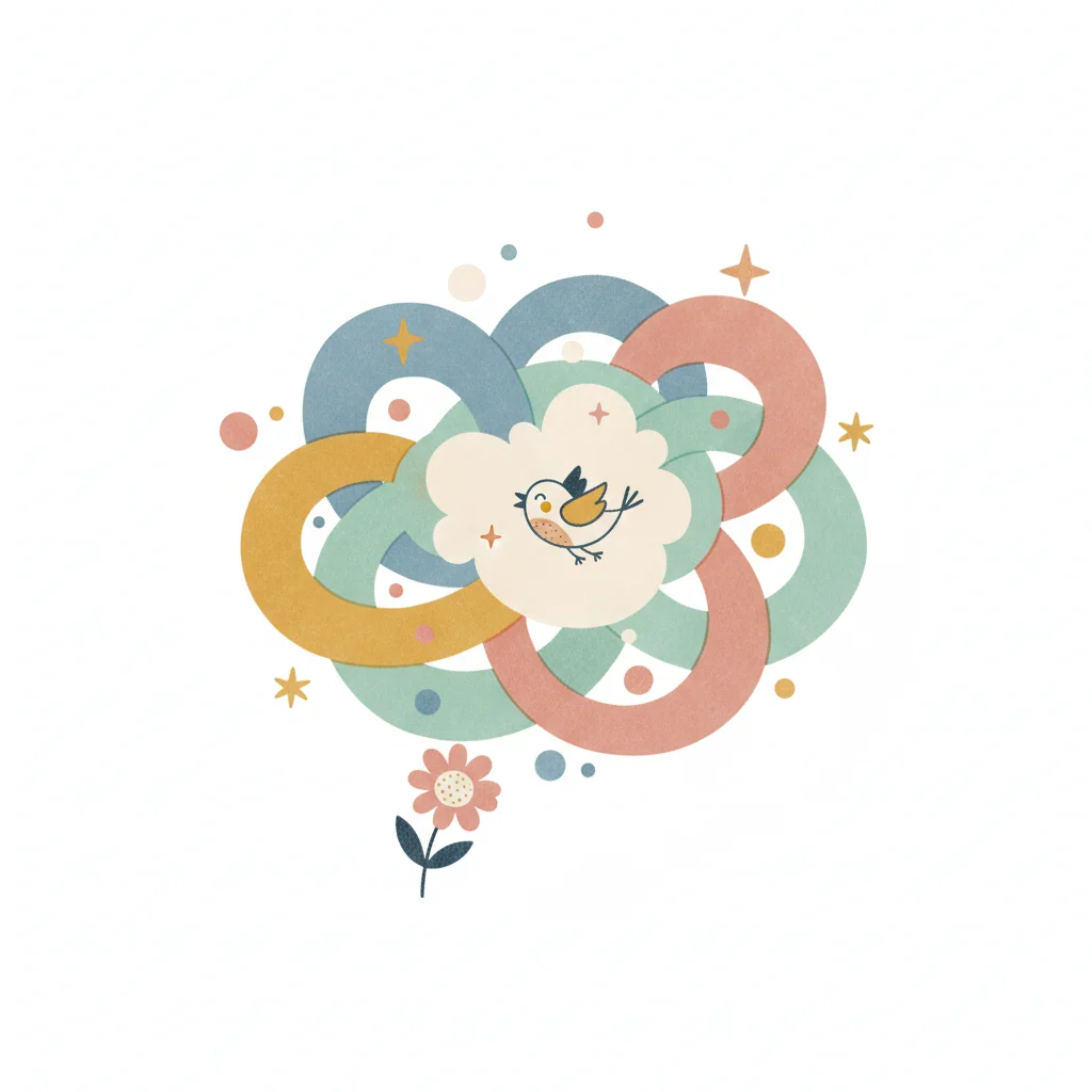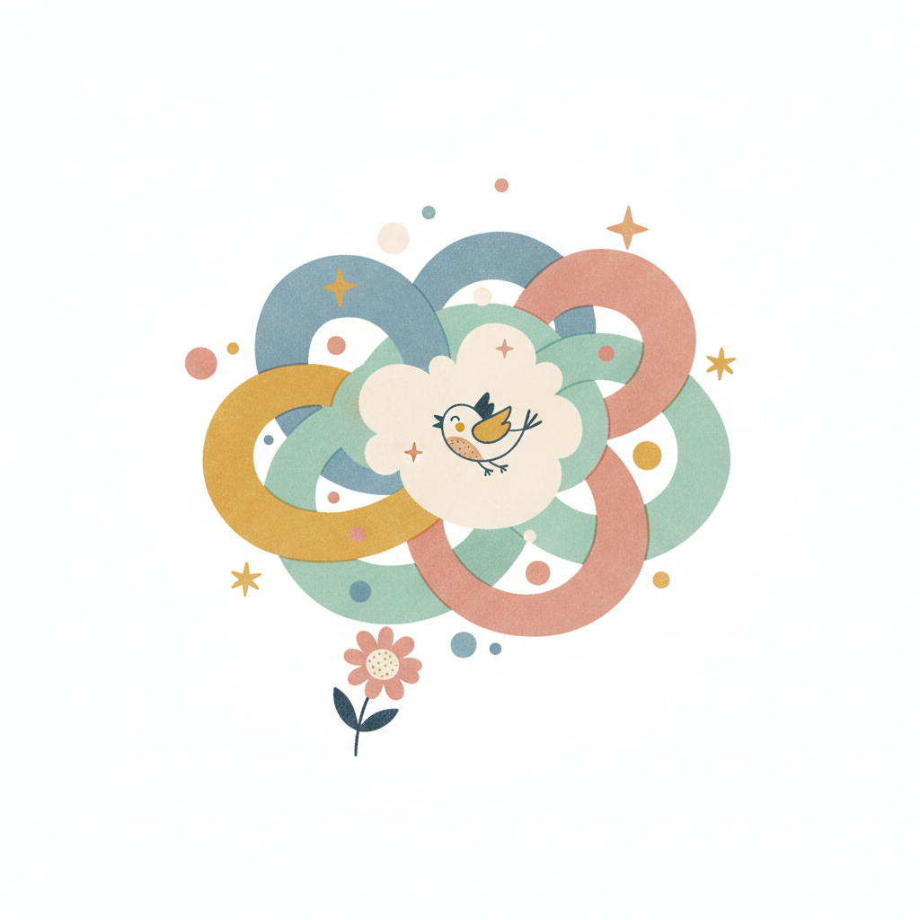 Verspielte Illustration: Vogel in Wolke, umgeben von pastellfarbenen Ringen, Punkten und einer Blume.