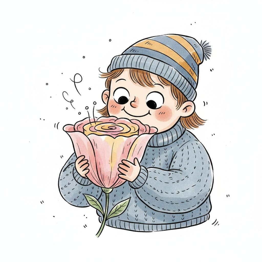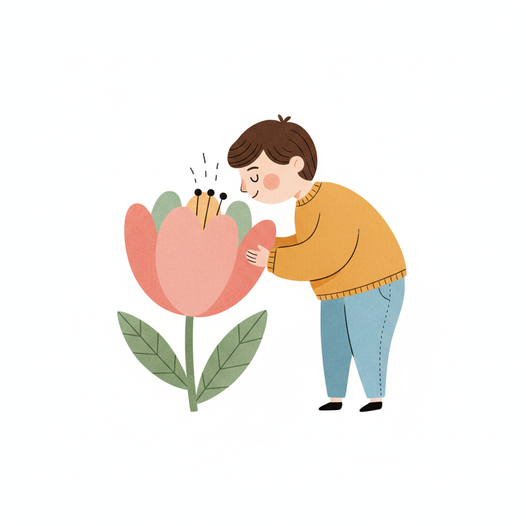 Ein glücklicher Cartoon-Junge mit geschlossenen Augen riecht genüsslich an einer rosa Blume.