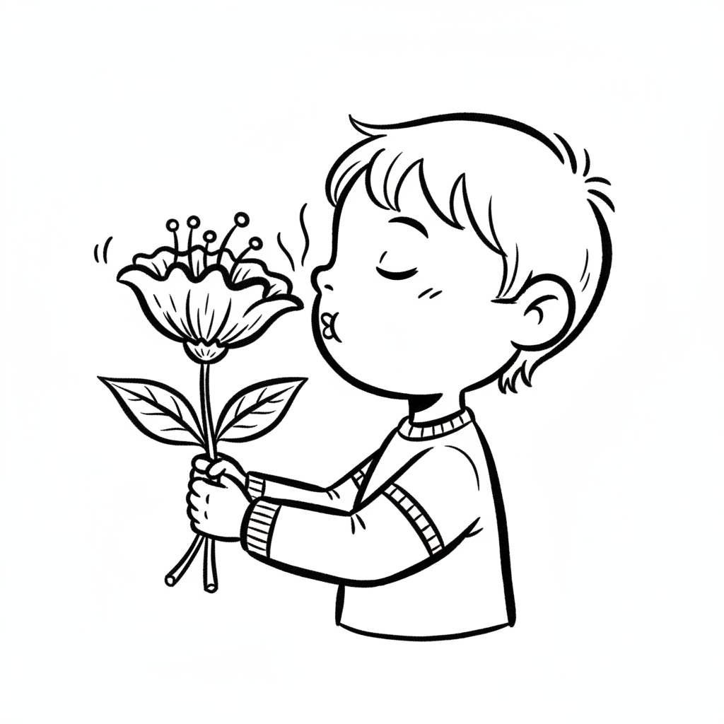 Schwarz-weiß-Zeichnung eines Jungen, der genüsslich an einer Blume riecht.