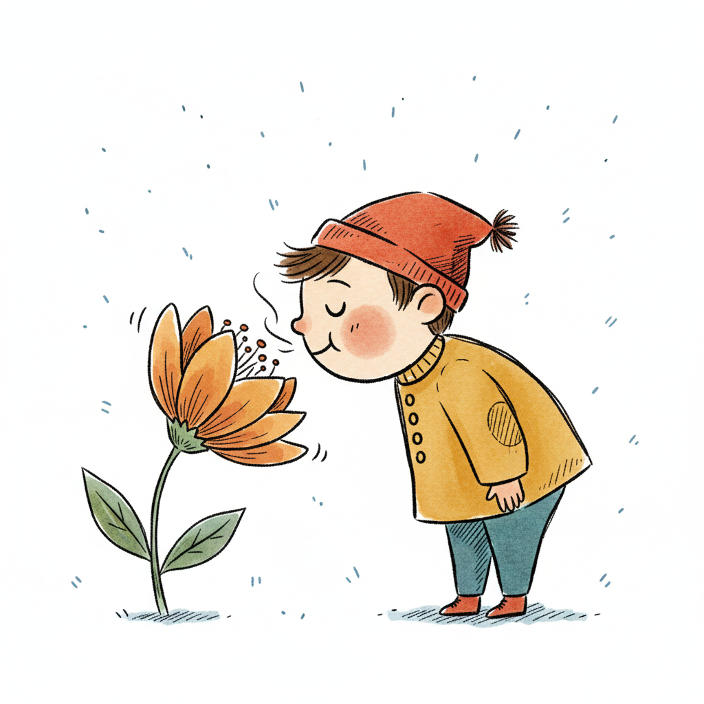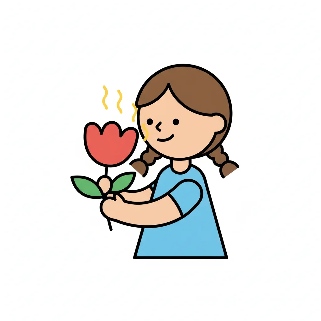 Ein Cartoon-Kind riecht genüsslich an einer roten Blume, Duftwellen symbolisieren den Geruch.