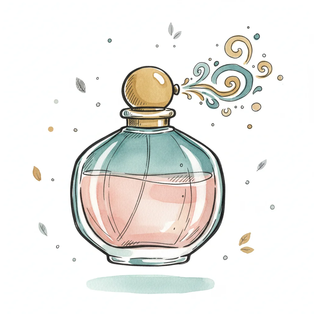 Aquarell-Illustration eines Parfümflakons mit rosa Flüssigkeit und duftenden Wirbeln.
