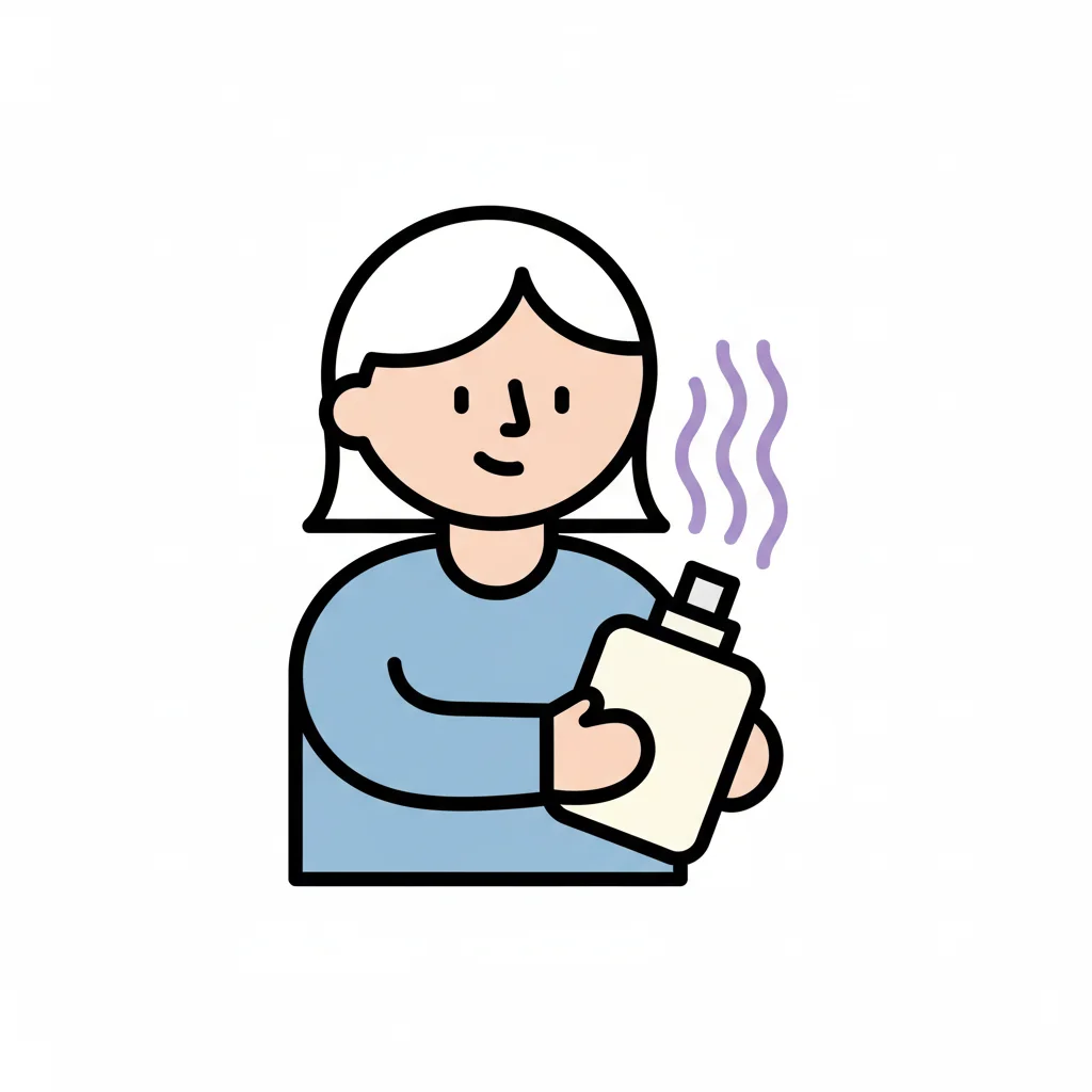 Eine lächelnde Person hält eine Flasche, aus der Dampf oder Duft aufsteigt.