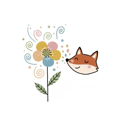 Niedlicher Fuchs schnüffelt an bunter Blume, umgeben von farbigen Punkten und Wirbeln.