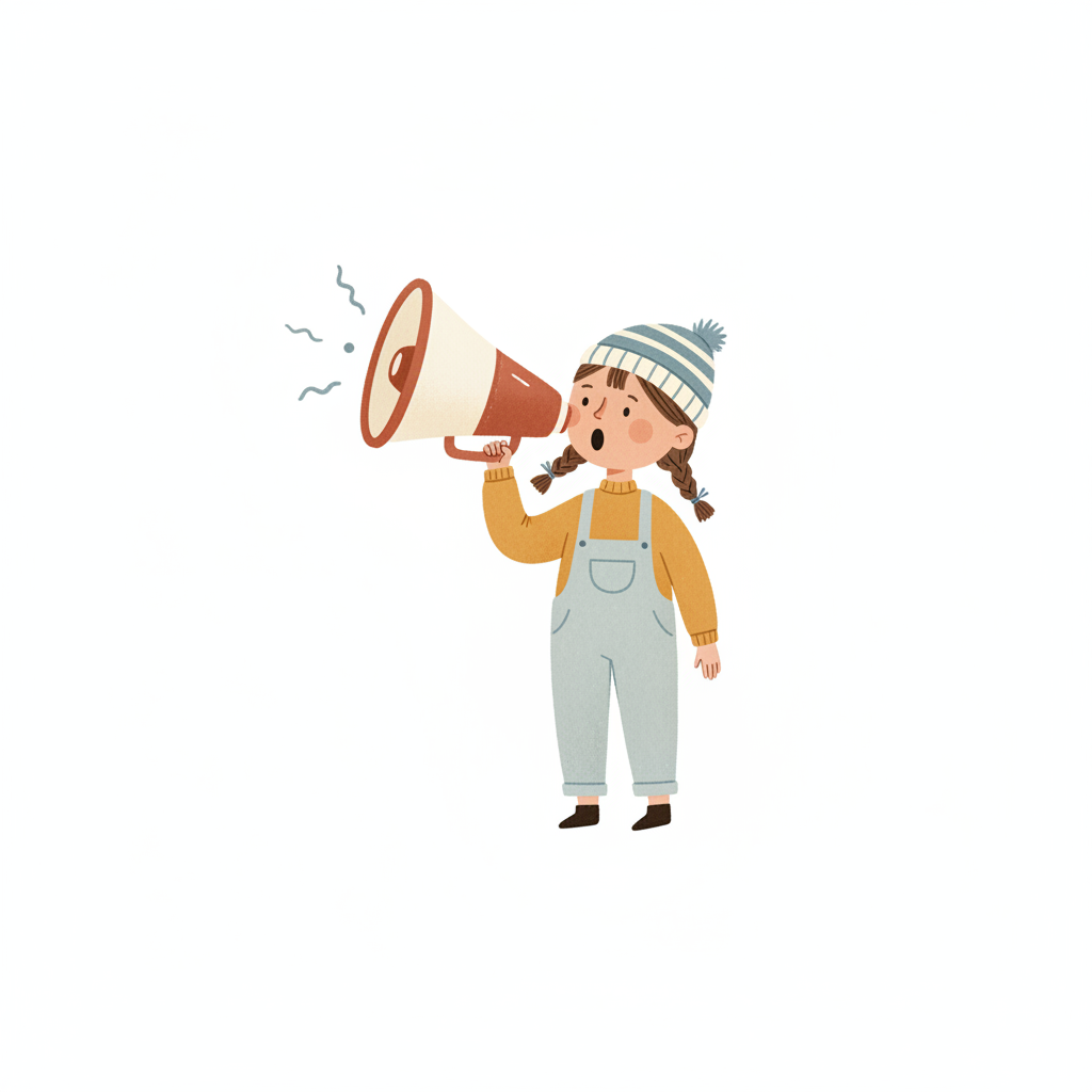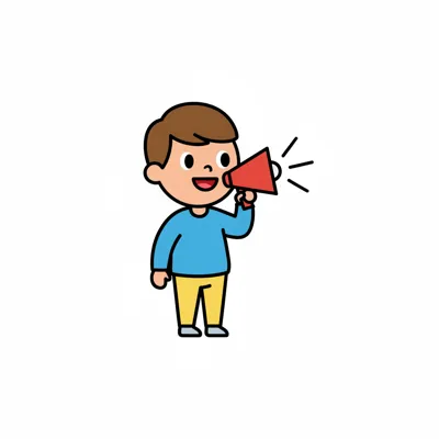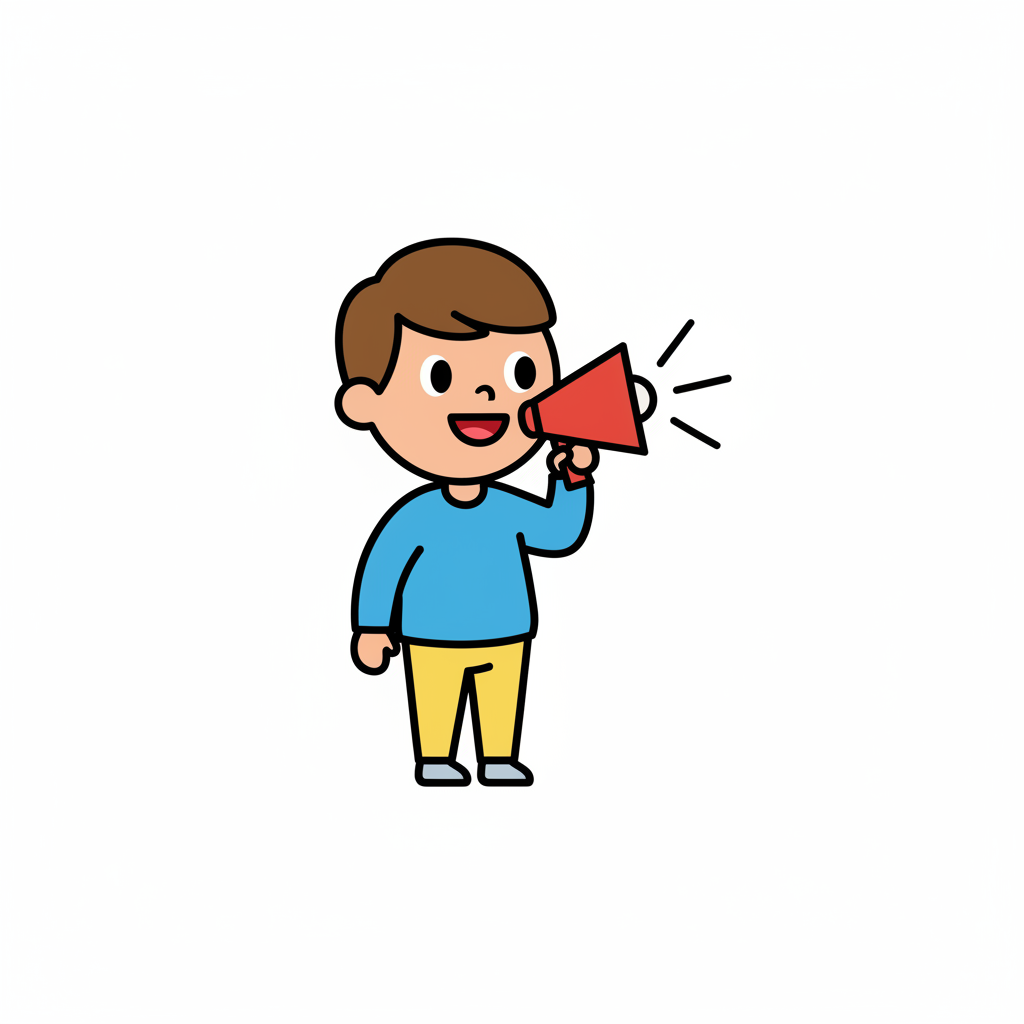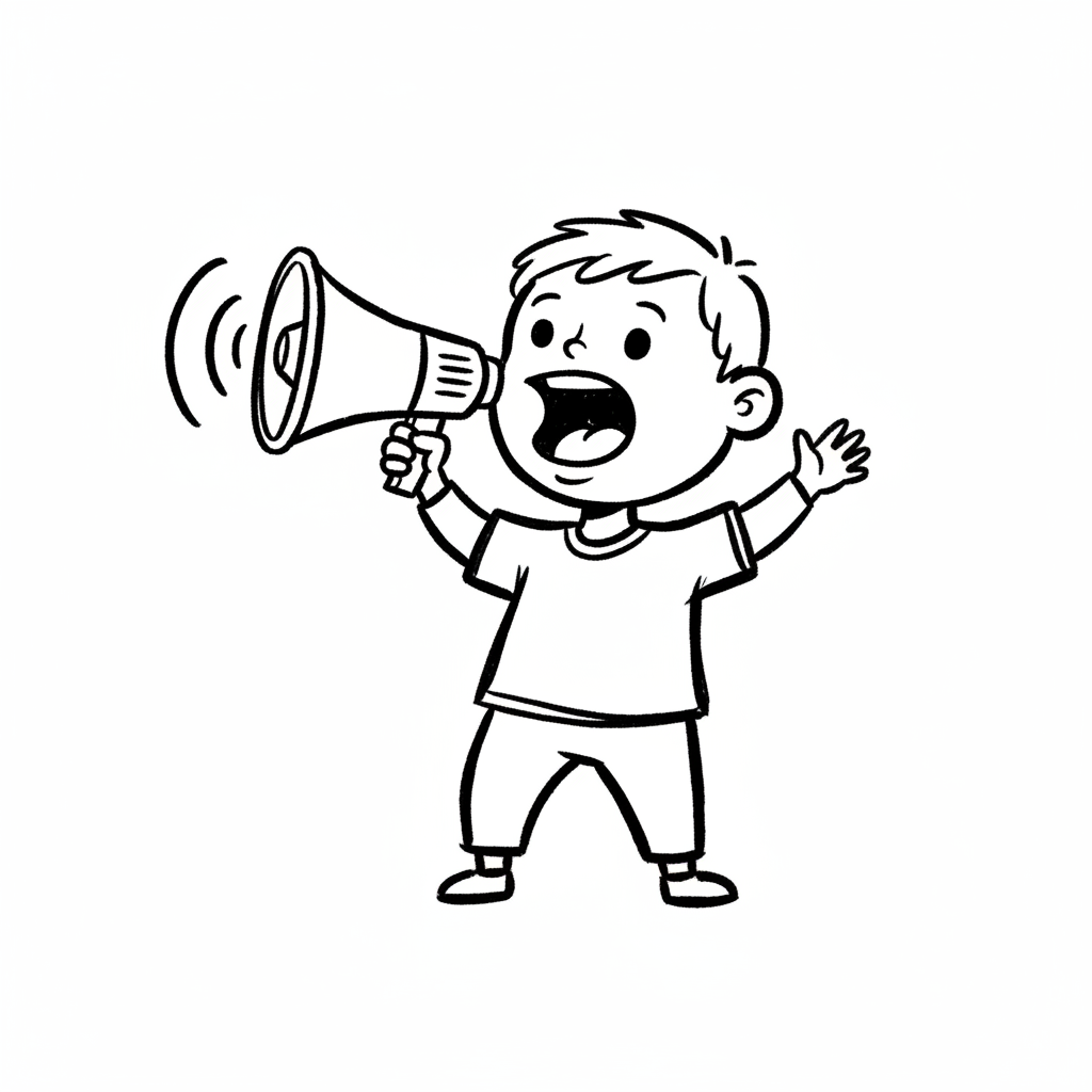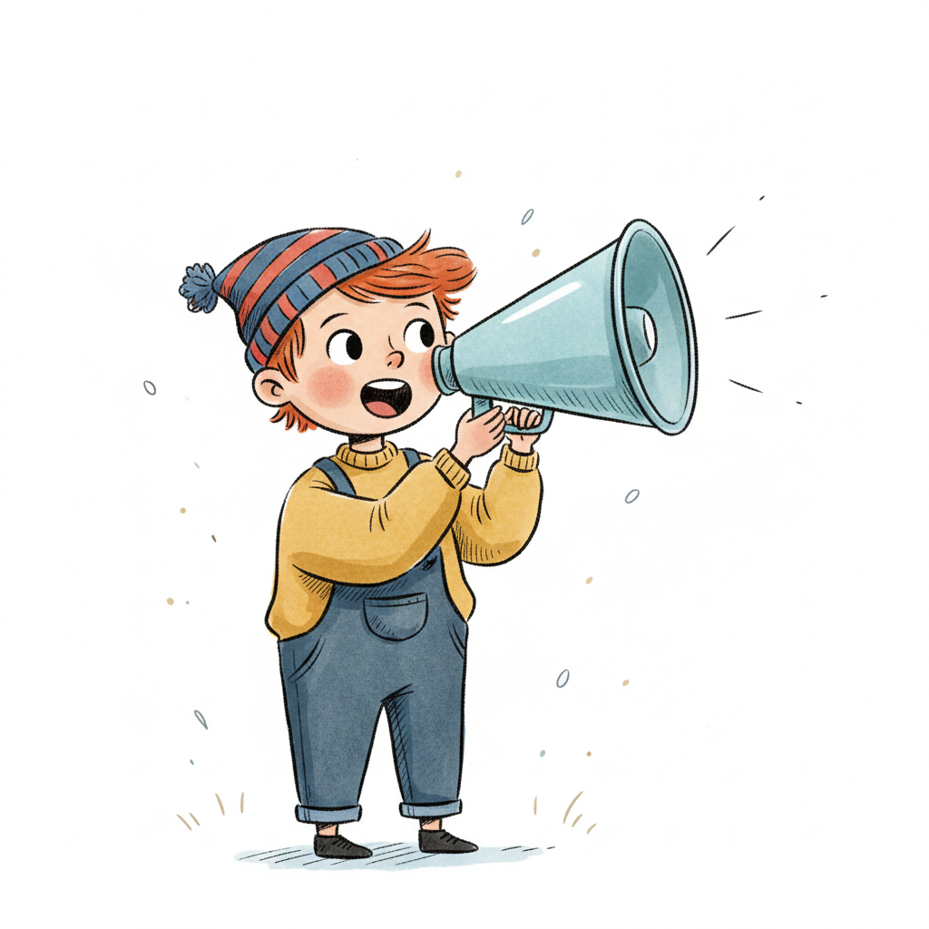 Ein fröhlicher Cartoon-Junge spricht in ein Megafon, aus dem Schallwellen kommen.