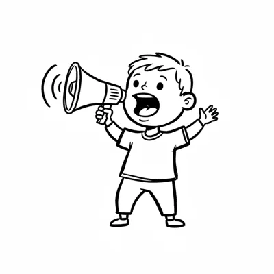 Schwarz-weiß-Zeichnung eines Jungen, der mit einem Megafon ruft.